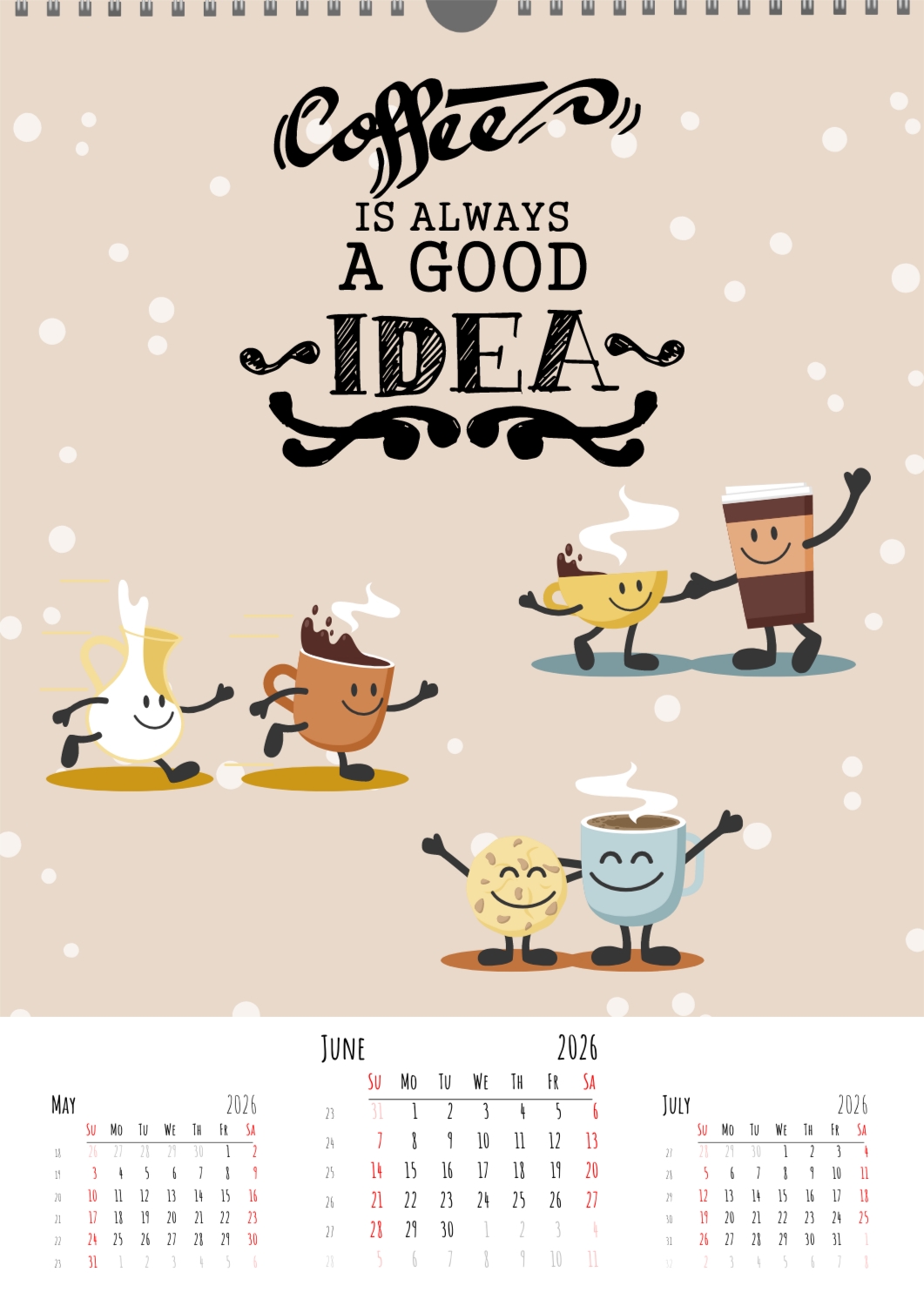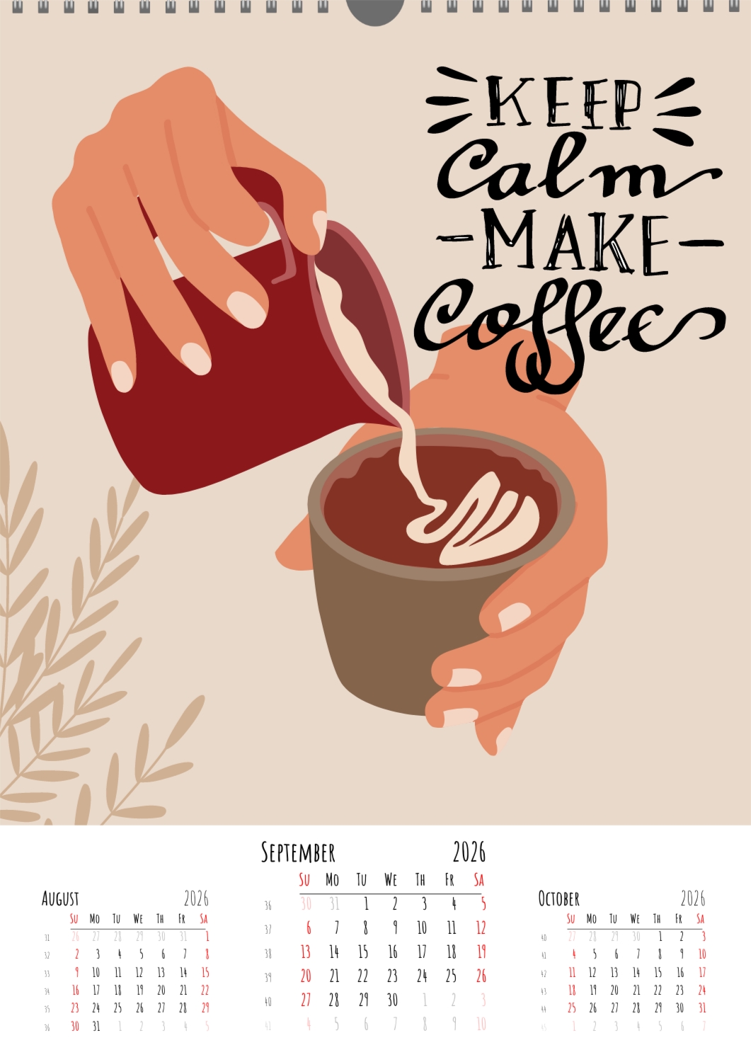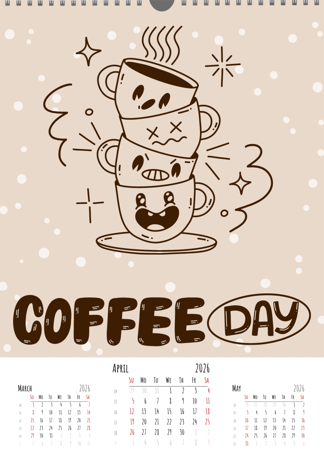 Free wall advertising calendar template to advertise your coffee shop or coffee shop. Create a layout with your own hands in the online calendar designer.