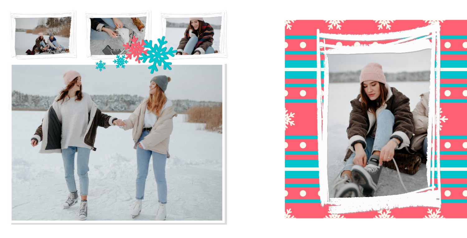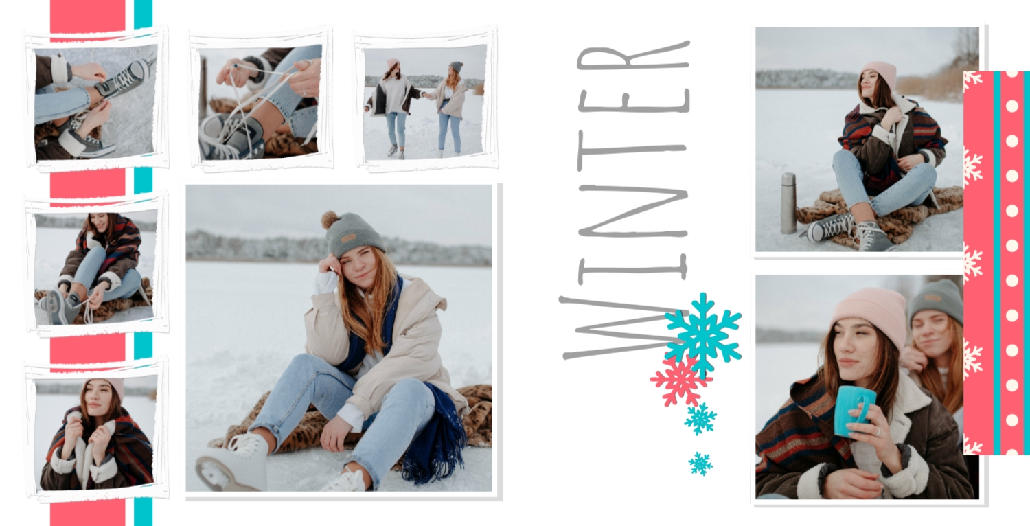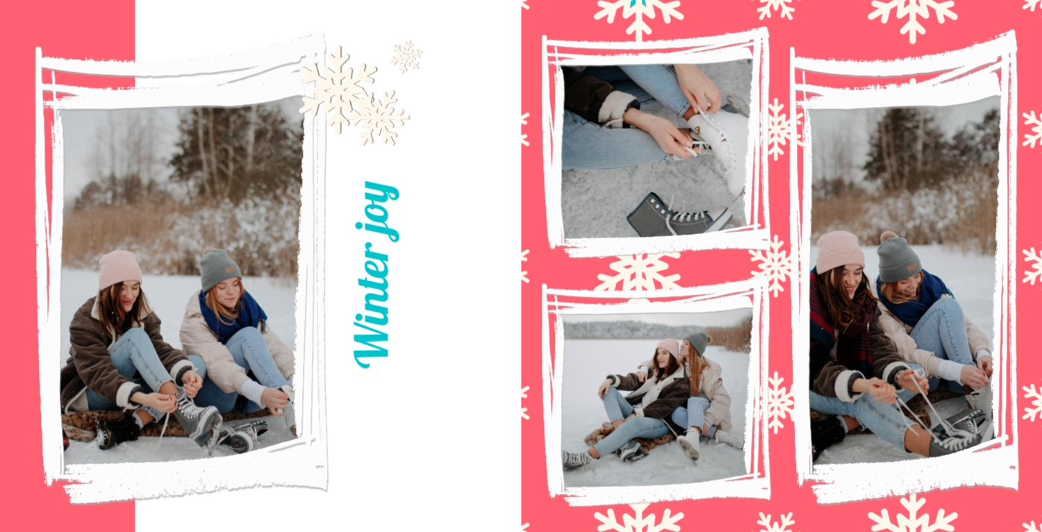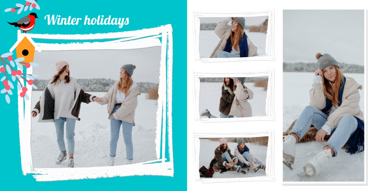 Free photo book template for good memories of winter holidays, vacations, winter photo shoot. Create a layout of a square photo book with your own hands in the online photo book designer.