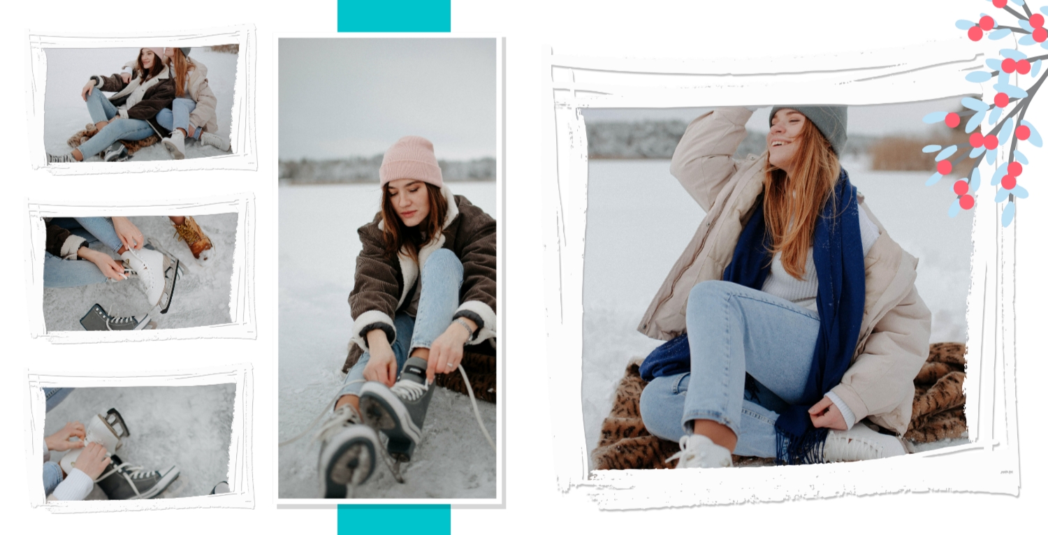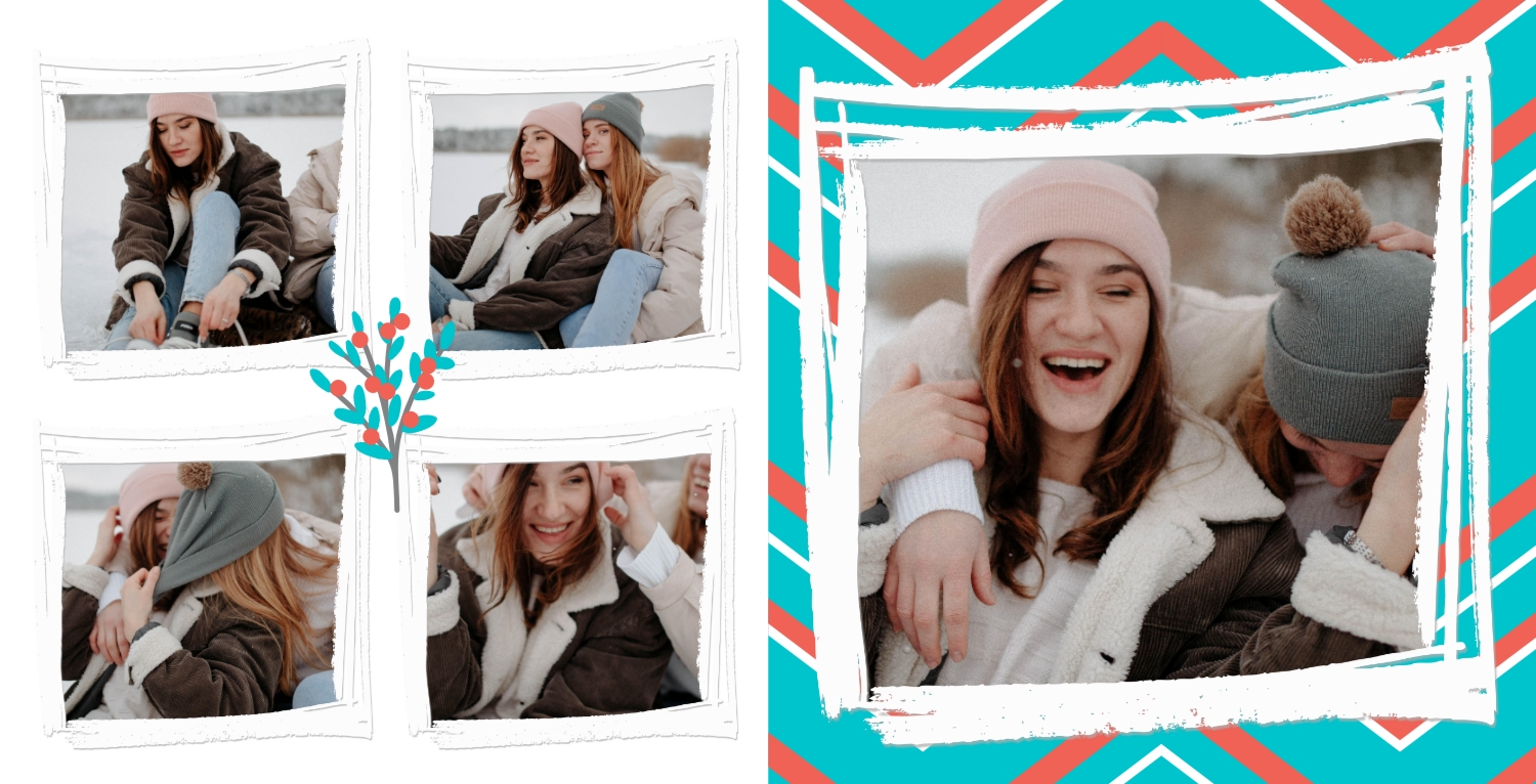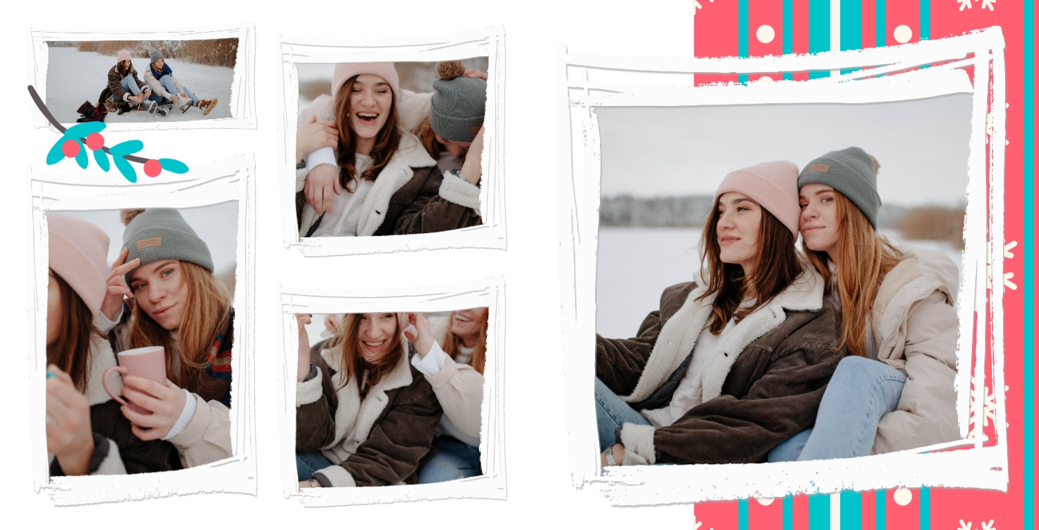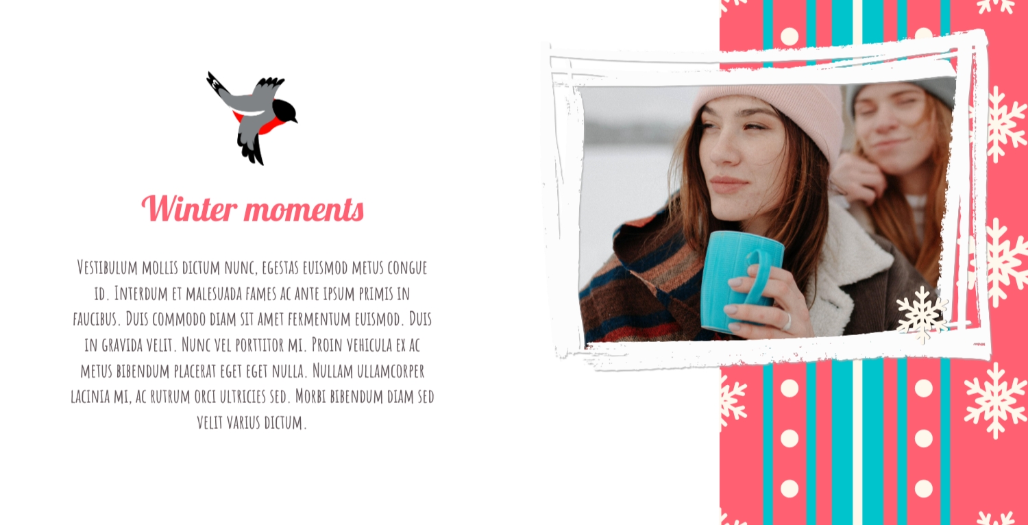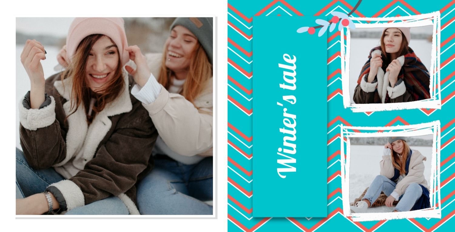 Free photo book template for good memories of winter holidays, vacations, winter photo shoot. Create a layout of a square photo book with your own hands in the online photo book designer.