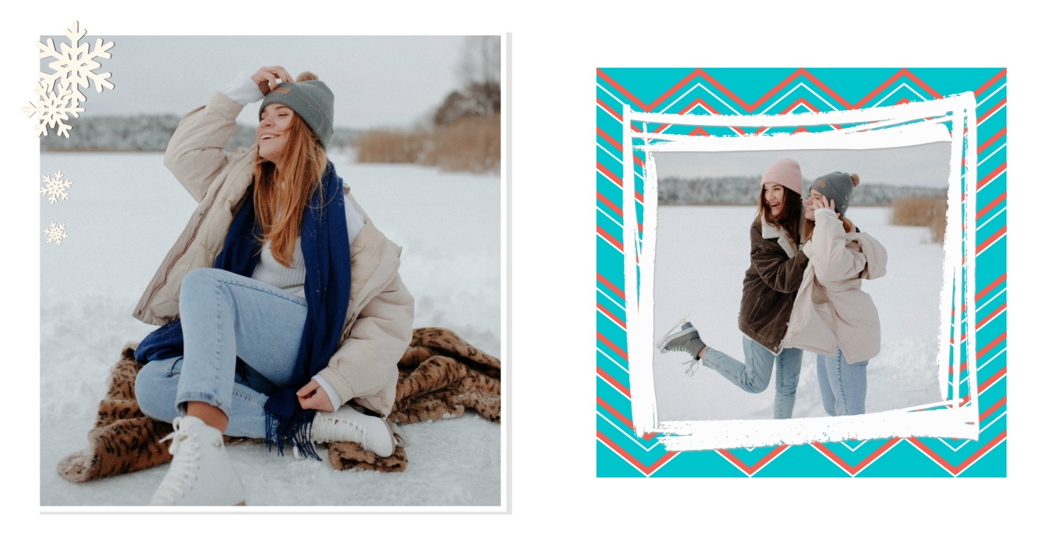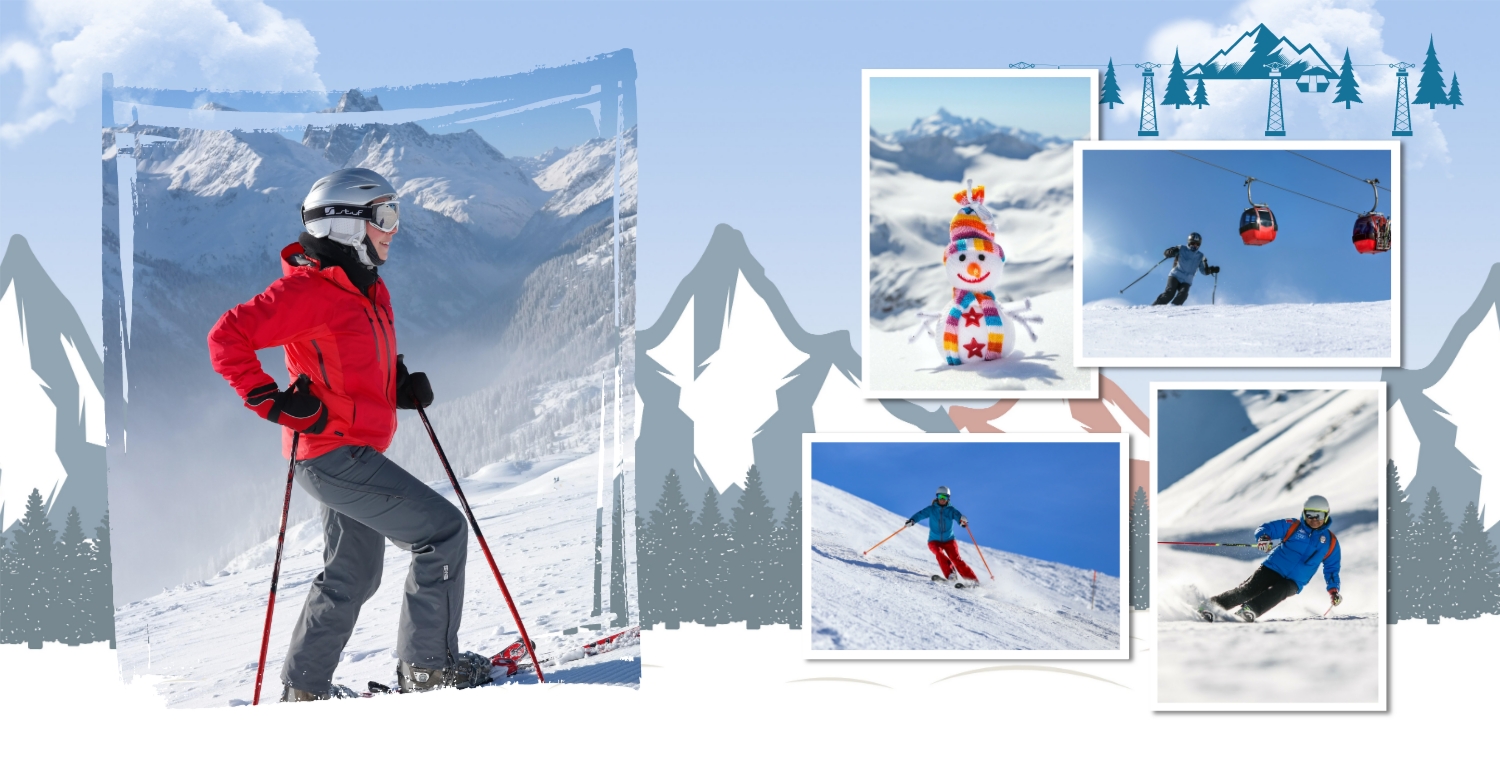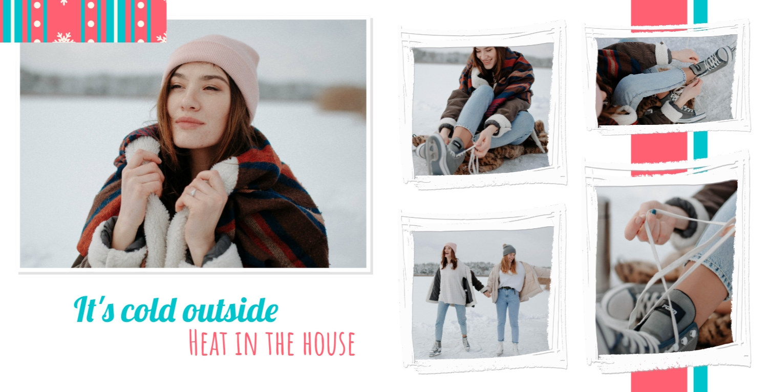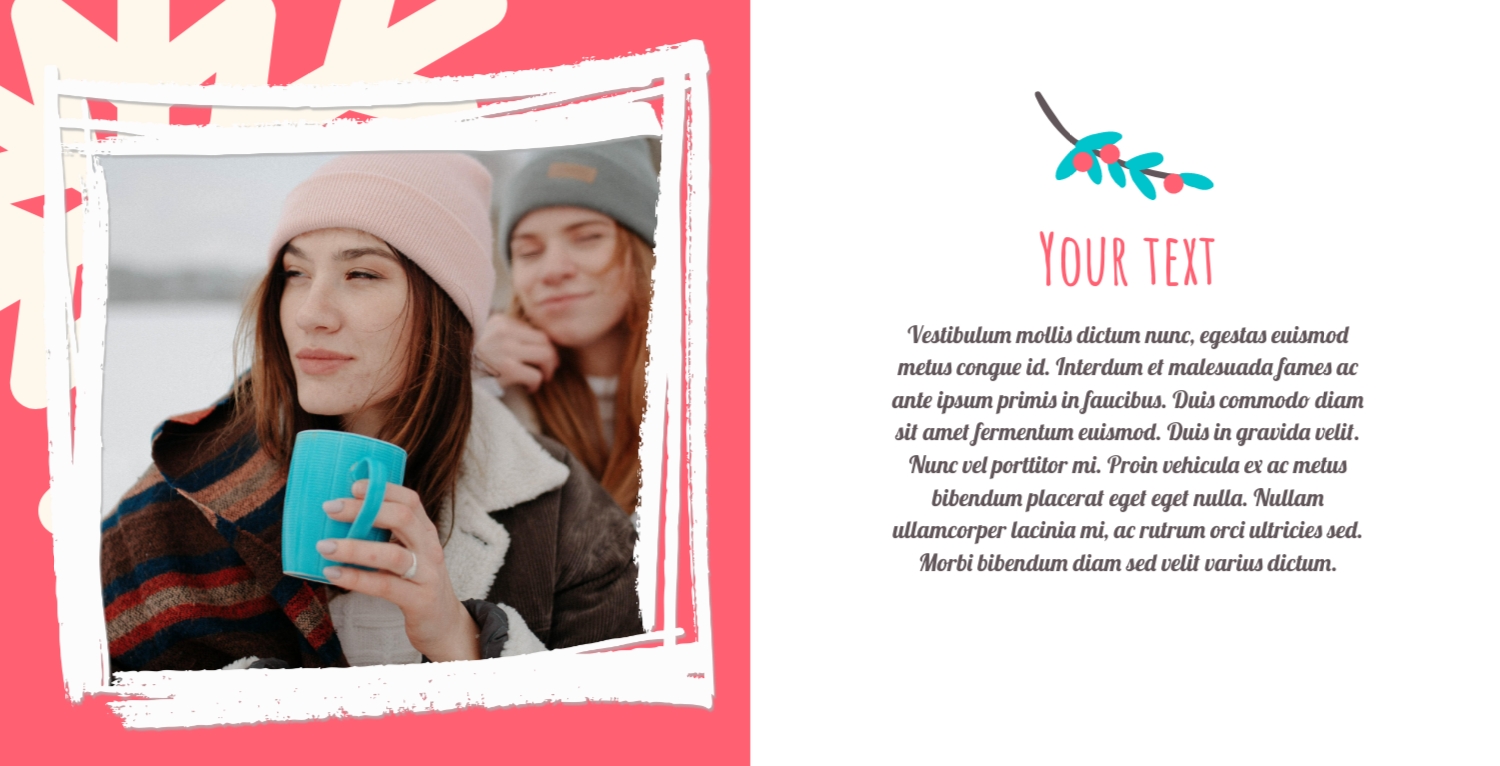 Free photo book template for good memories of winter holidays, vacations, winter photo shoot. Create a layout of a square photo book with your own hands in the online photo book designer.