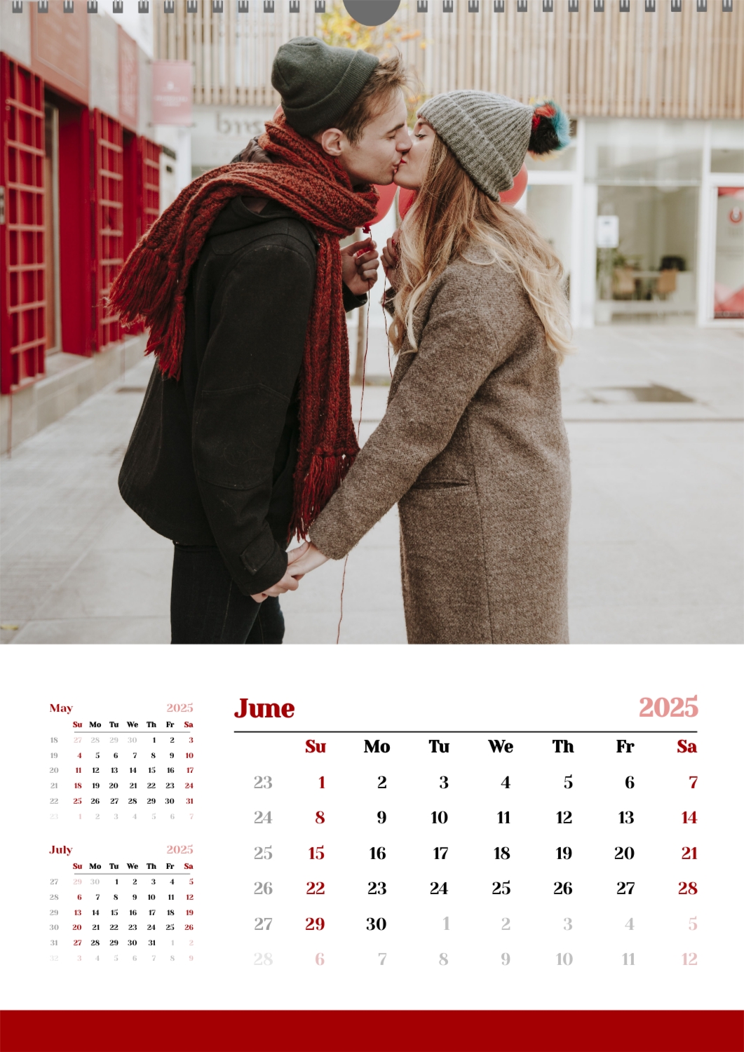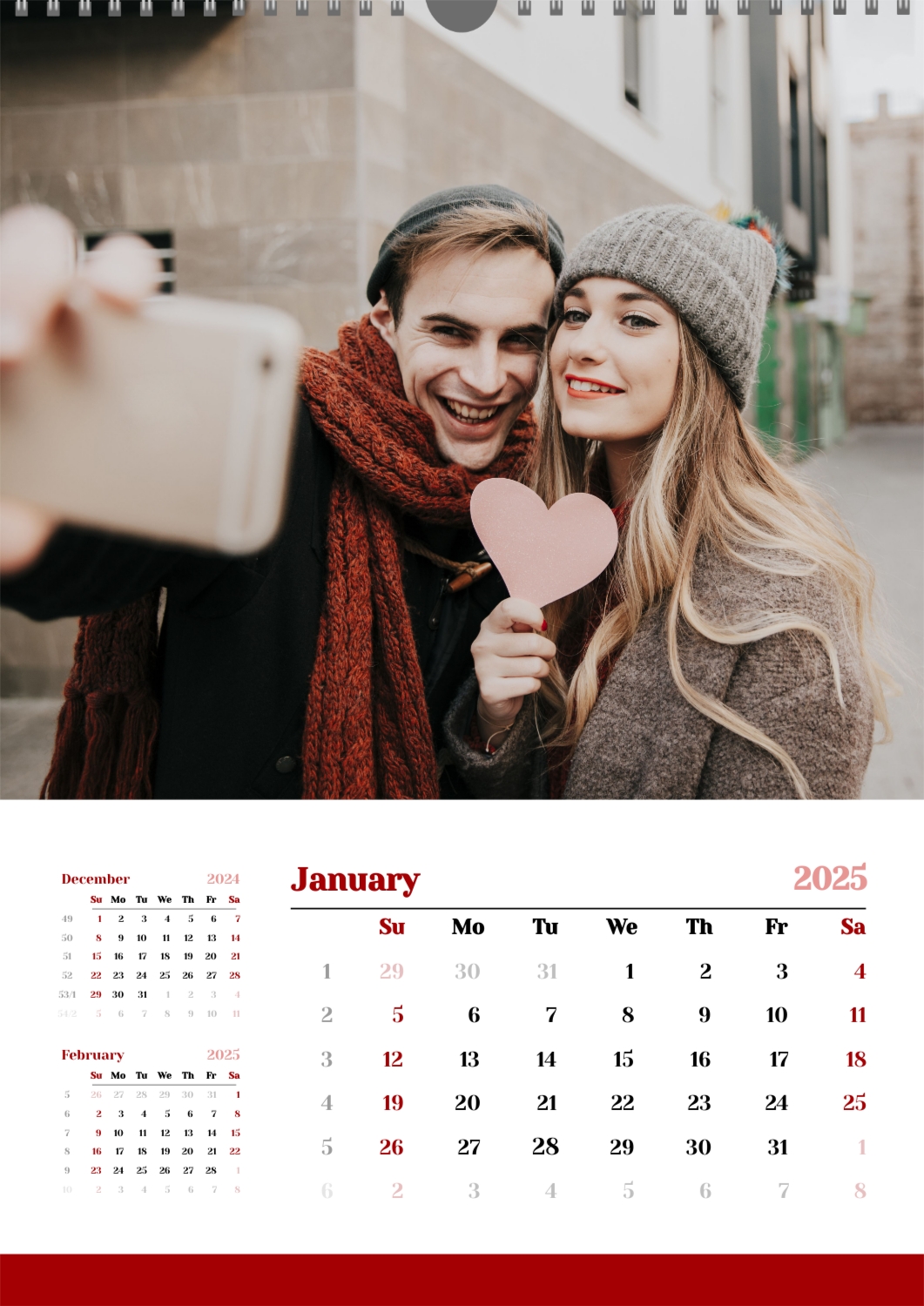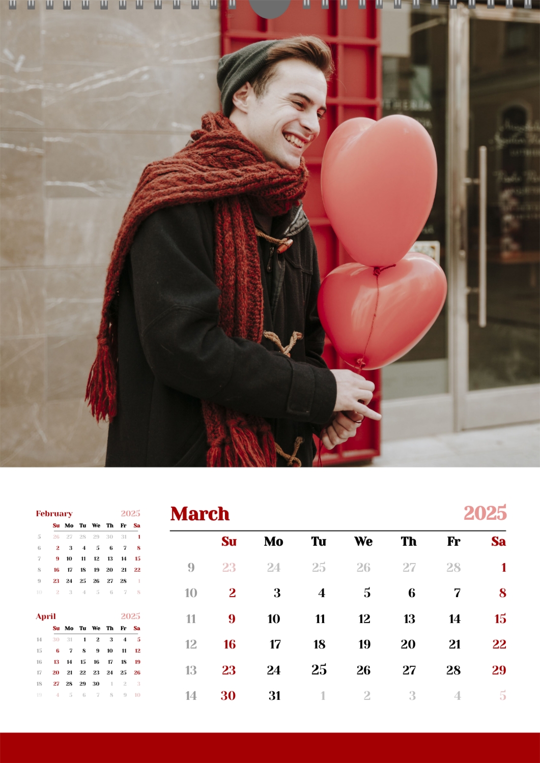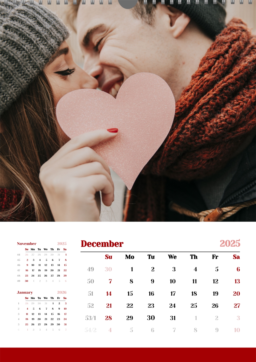 The magic of winter has been transformed into an elegant "Happy Winter" wall calendar template created especially for lovers. This unique design combines delicate shades of winter radiance and warm notes of love. It is designed to become not only a practical time-keeping tool, but also a gentle reminder of your most important days. The ease of editing in our online designer allows you to express your feelings and create a calendar that will reflect your unique love. Use a variety of decorative elements built into the designer to emphasize the atmosphere of the season. Arrange stars and snowflakes on the pages, creating a magical winter landscape. This is your chance to realize your fantasies and give the calendar an individual charm. Special sections for important dates and events allow you to mark important moments of your love story. There may be days of iconic meetings, days of kissing under blizzards, or just moments that have become key in your life together.