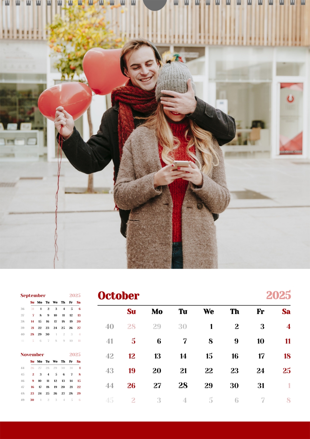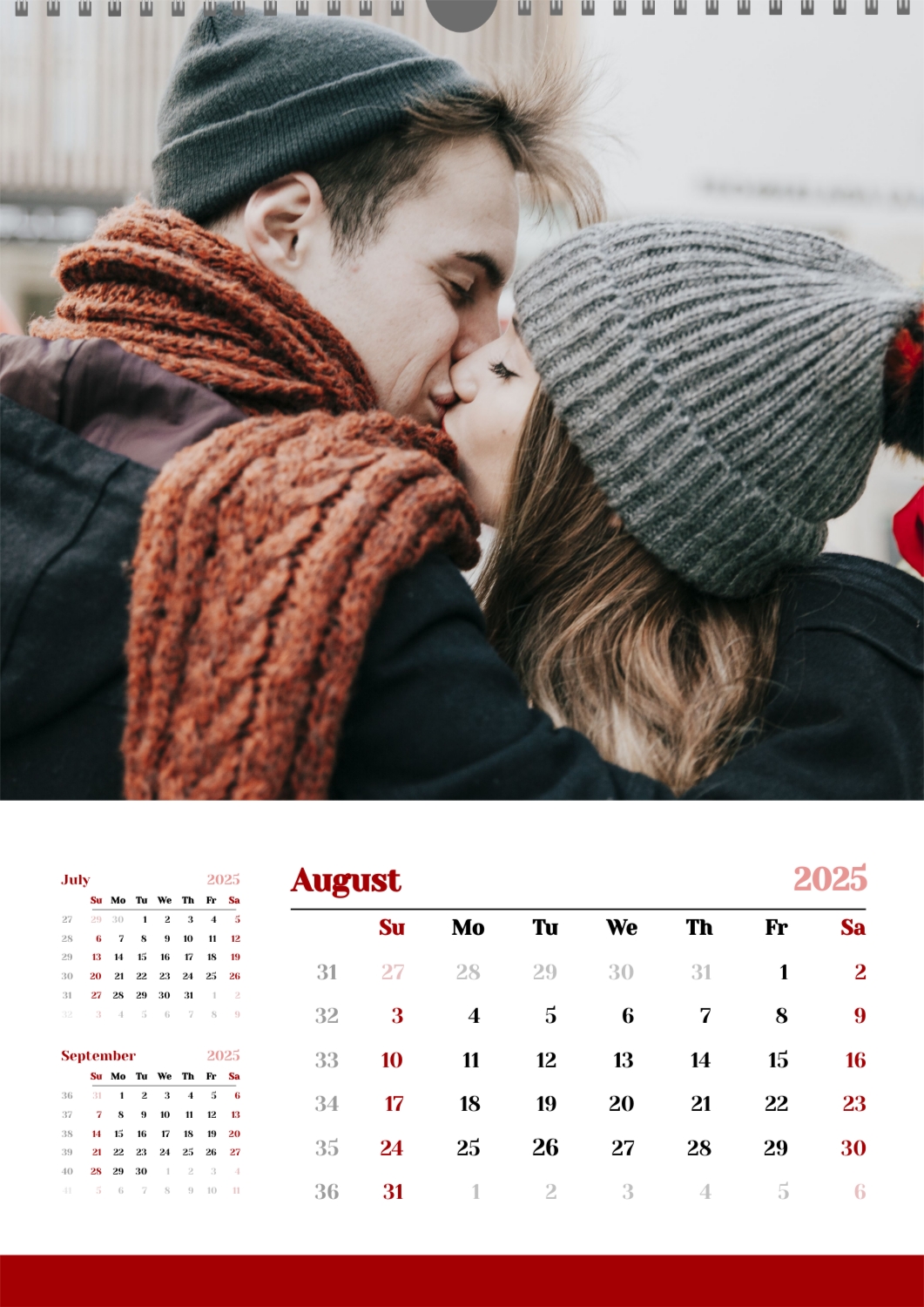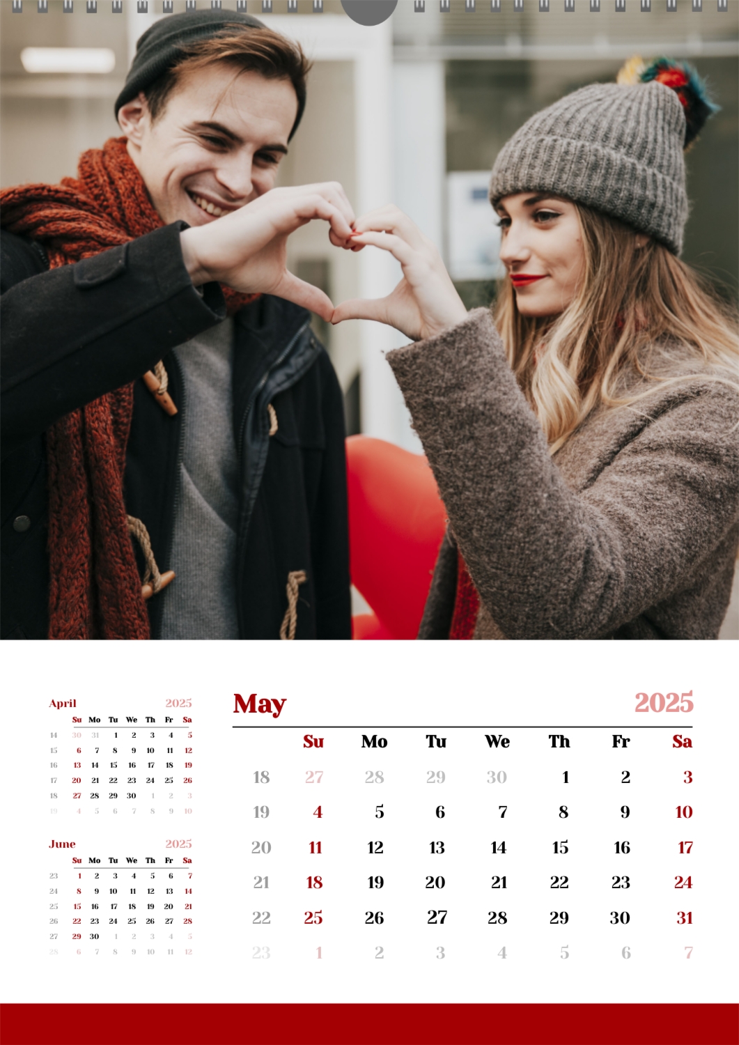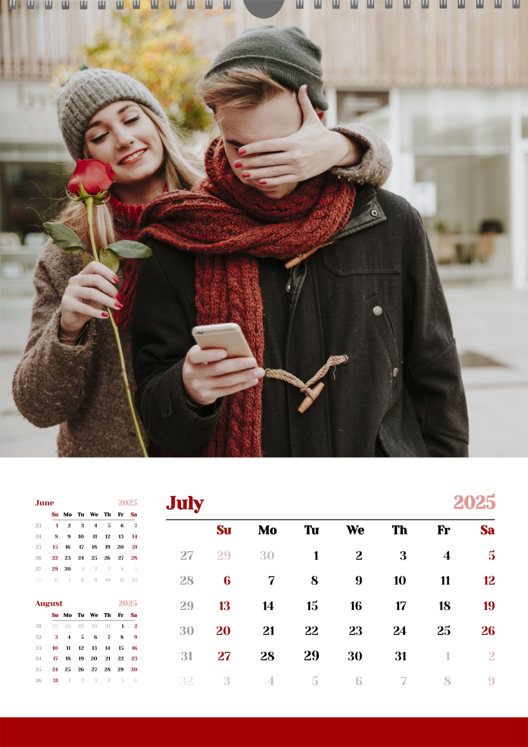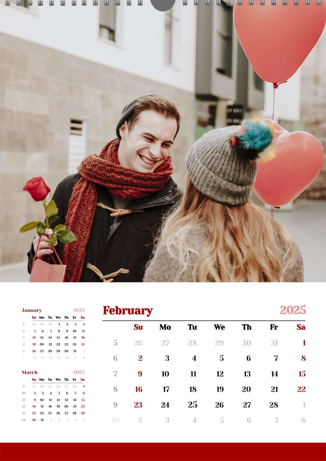 The magic of winter has been transformed into an elegant "Happy Winter" wall calendar template created especially for lovers. This unique design combines delicate shades of winter radiance and warm notes of love. It is designed to become not only a practical time-keeping tool, but also a gentle reminder of your most important days. The ease of editing in our online designer allows you to express your feelings and create a calendar that will reflect your unique love. Use a variety of decorative elements built into the designer to emphasize the atmosphere of the season. Arrange stars and snowflakes on the pages, creating a magical winter landscape. This is your chance to realize your fantasies and give the calendar an individual charm. Special sections for important dates and events allow you to mark important moments of your love story. There may be days of iconic meetings, days of kissing under blizzards, or just moments that have become key in your life together.