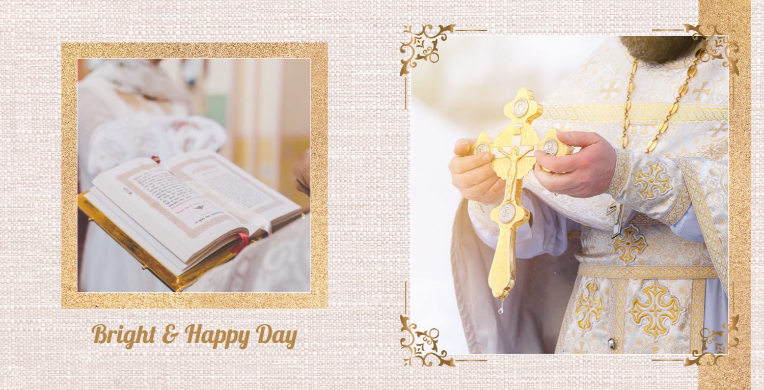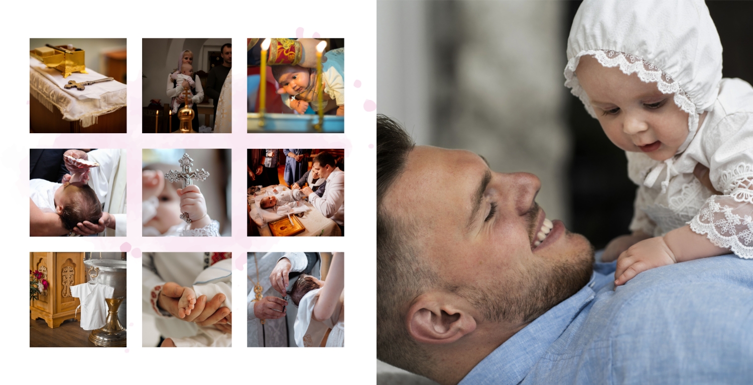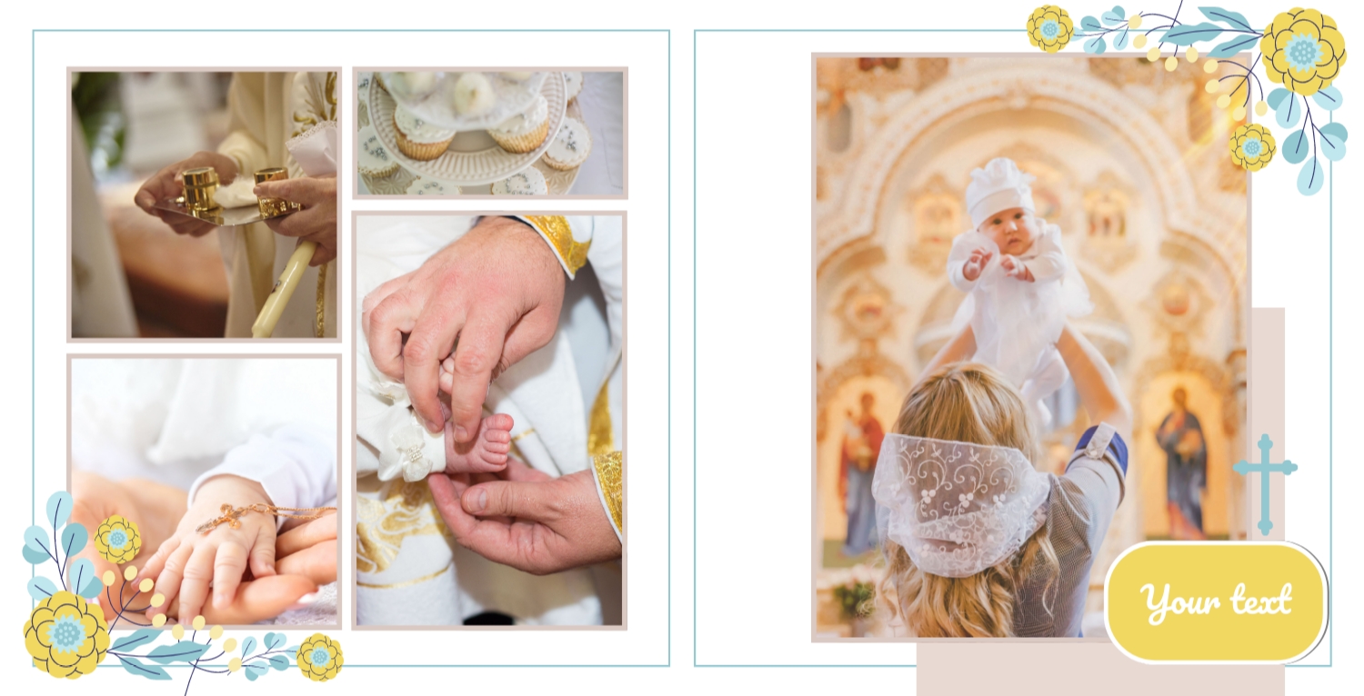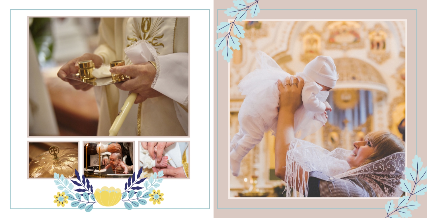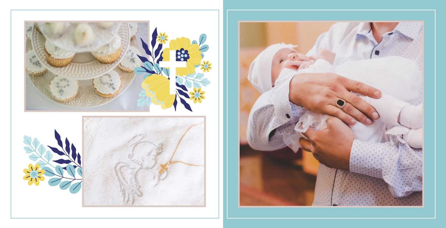 The ready-made photobook template in a hard cover "Sacrament of Baptism" was created to capture the bright and important moments of this significant event. It is suitable for parents, godparents, photographers and anyone who wants to design a memorable album about the baptism of a child. This design will also be useful for specialists involved in family and children's photography, church printing houses and organizers of baptismal events. The template is designed in delicate colors with elegant decorative elements symbolizing purity and grace. However, in our online designer, you can easily adapt it to your personal preferences. You can replace the background, change the color palette, add or remove decorations, and choose a convenient arrangement of photos. It is important that each page can be edited, blocks can be rearranged, signatures, stylized inscriptions or even personal wishes can be added. It is very easy to create your own unique square photo book. All you need to do is upload photos, adjust the layout to your taste and immediately see what the finished result will look like. The online designer allows you to save changes at any time and return to work later.