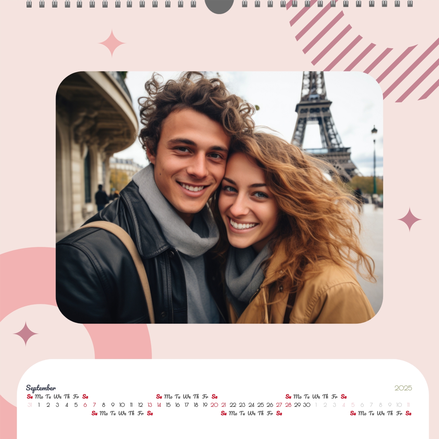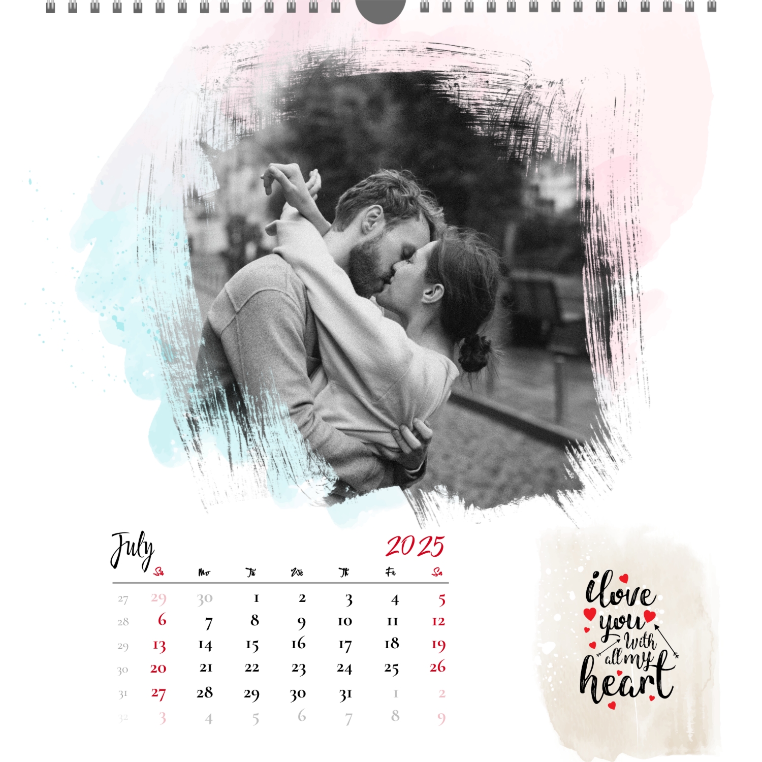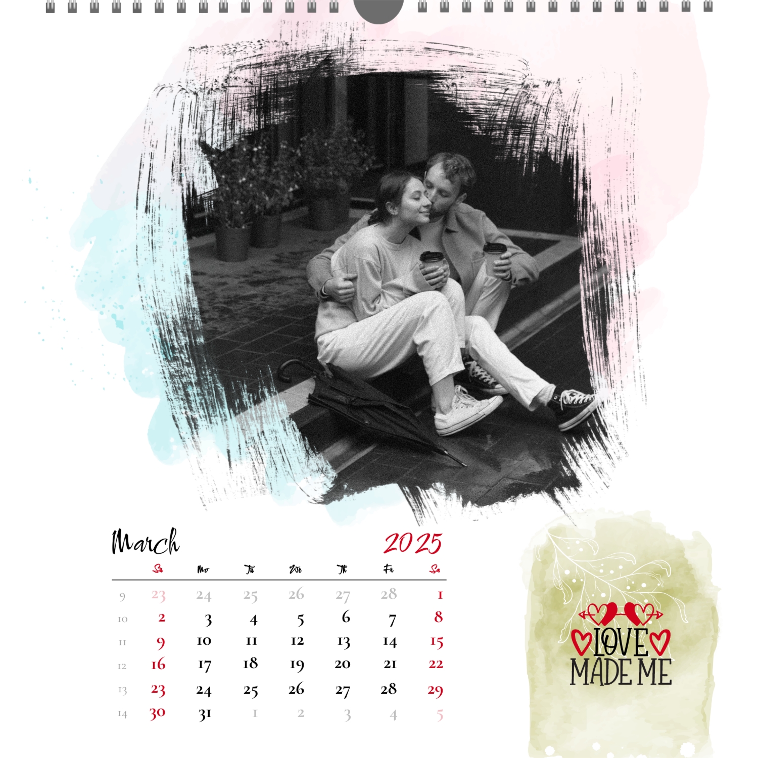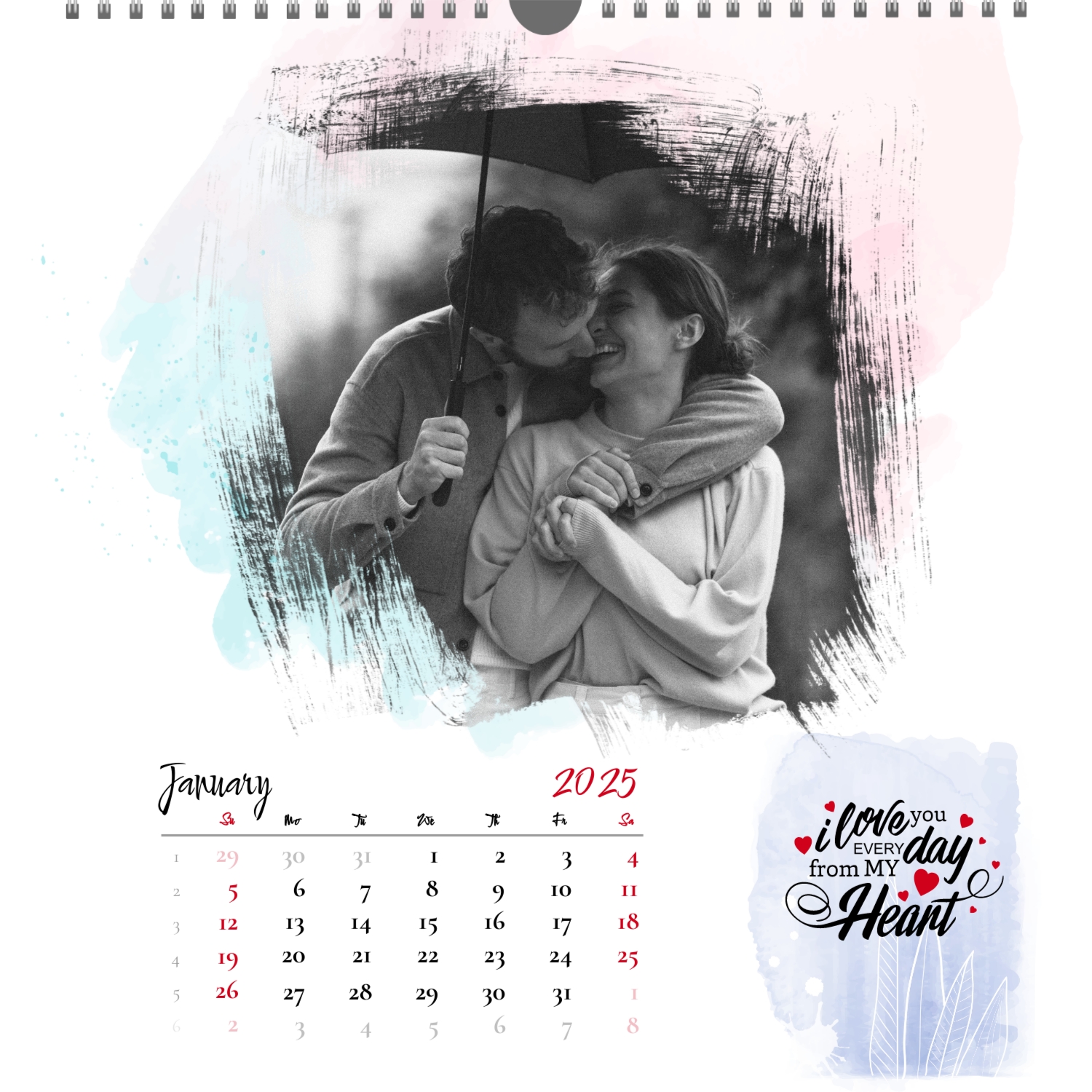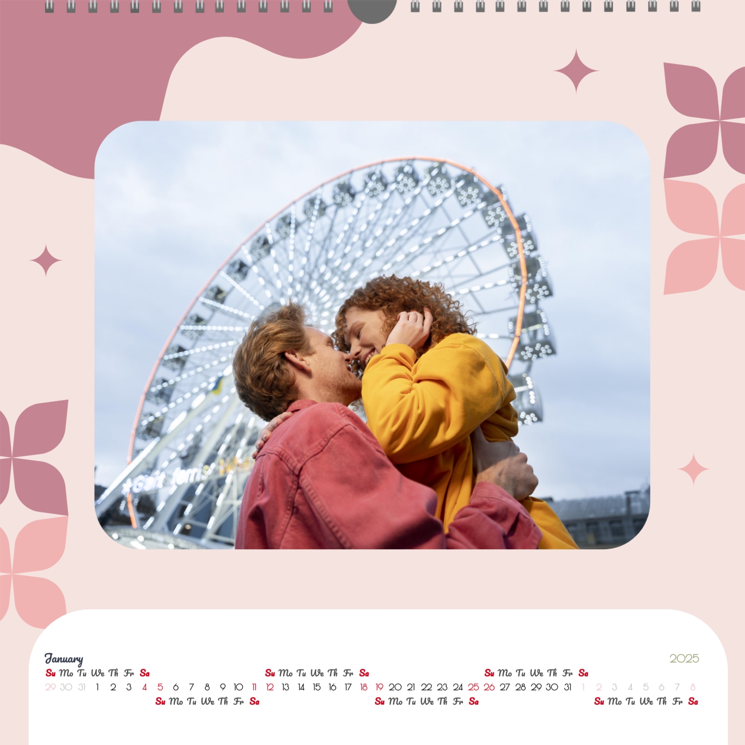A ready–made wall calendar template for a couple in love is the perfect way to create a unique and touching gift. It has a romantic design that highlights the special bond between the partners. Such a square wall calendar can become not only a pleasant souvenir, but also a stylish interior element. This template is great for photographers specializing in love story, as it can be used to create beautiful professional images. It will also be useful for designers and bloggers working in the romantic field, and it is also ideal for owners of wedding agencies who want to offer customers an unusual gift. The main advantage of this calendar is the possibility of full personalization in our online calendar builder. You can upload your photos, change the background, add memorable dates, romantic captions, or even funny comments to each month. Thanks to the simple and intuitive interface, editing will take a minimum of time, and the result will delight with personality and high quality. By creating such a calendar with your own hands, you put warmth and care into it, making it really special.