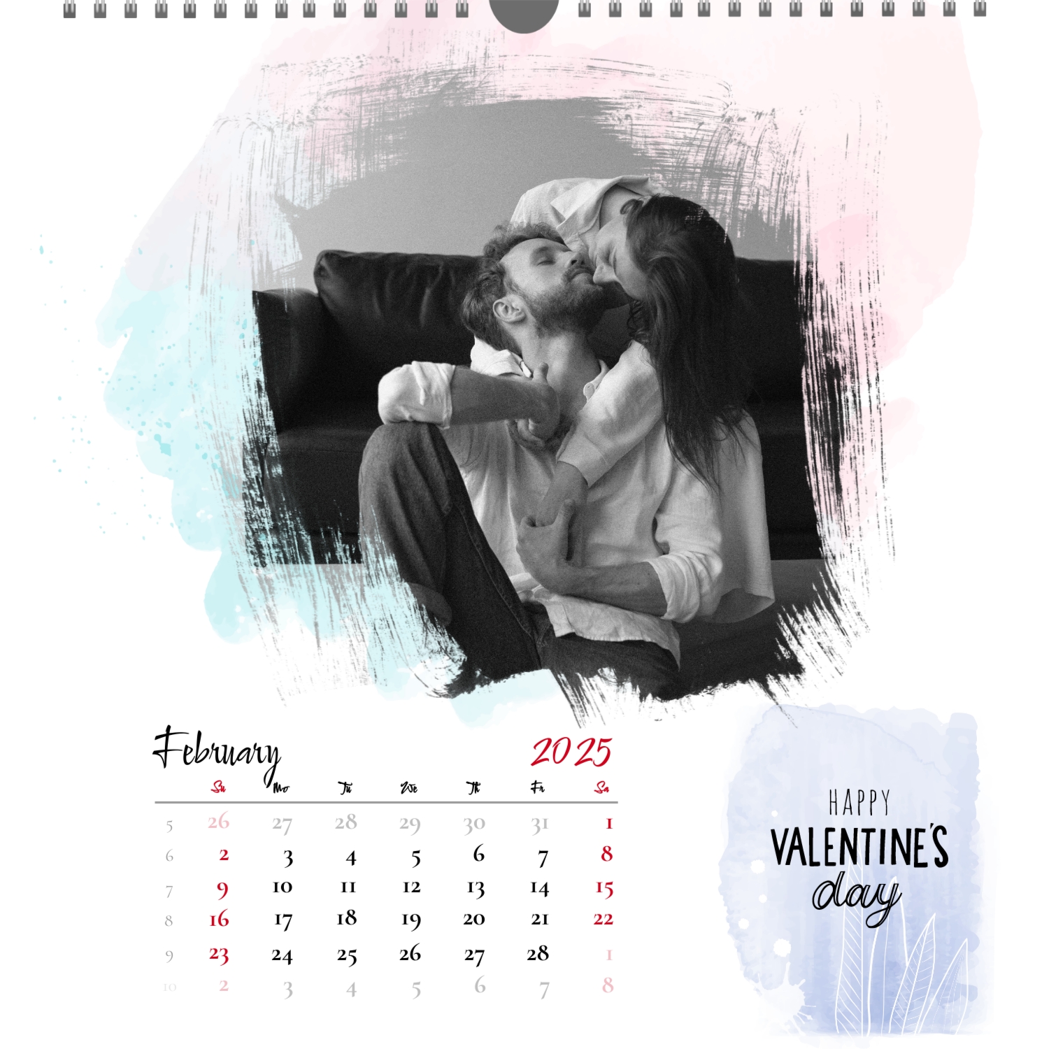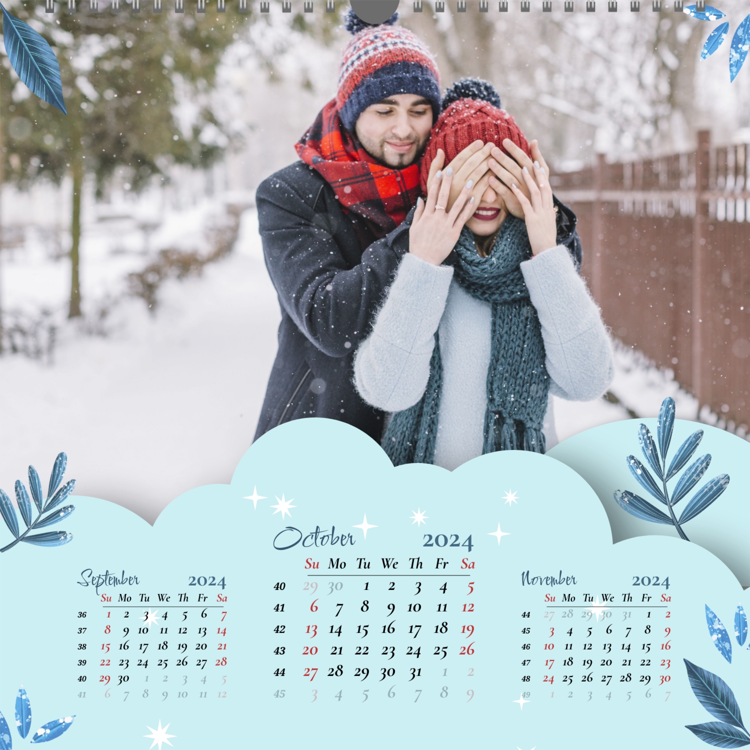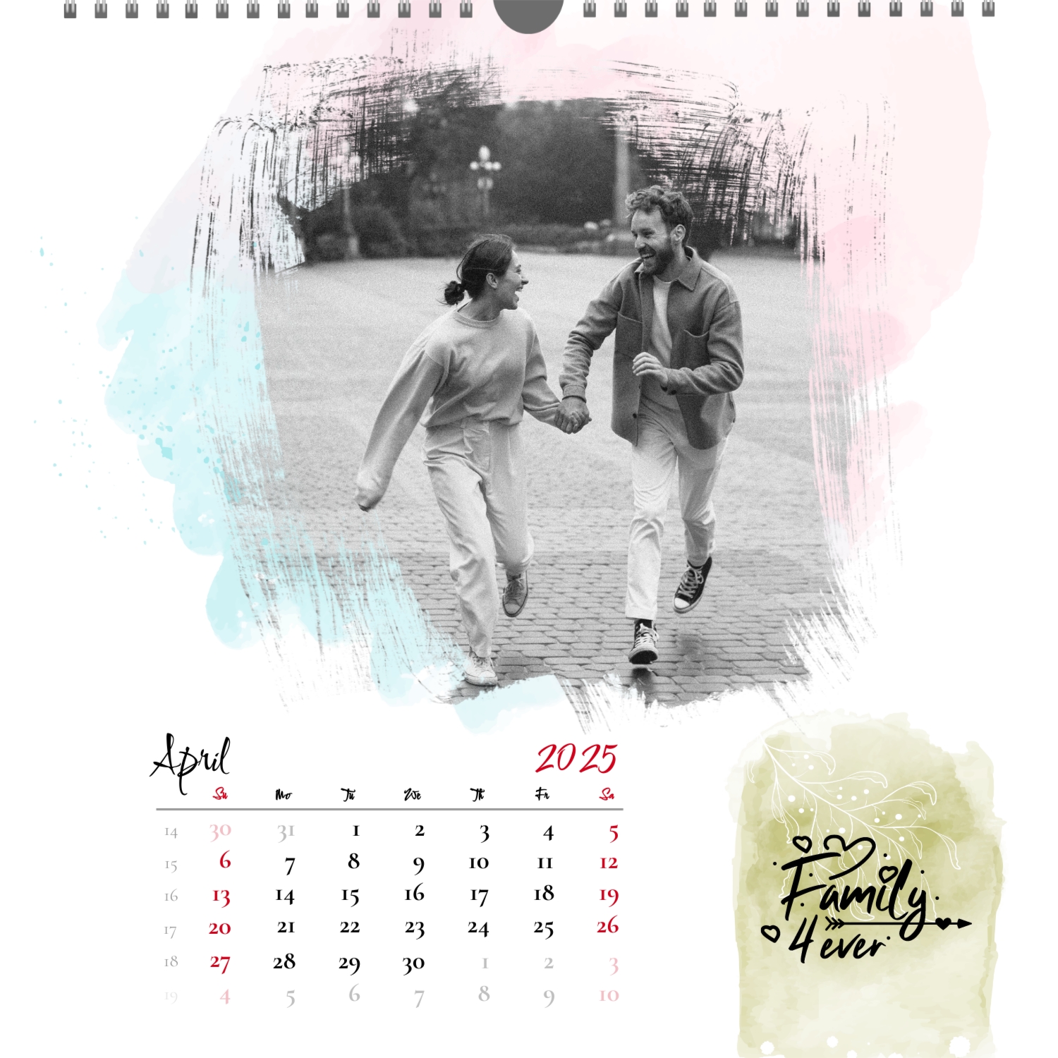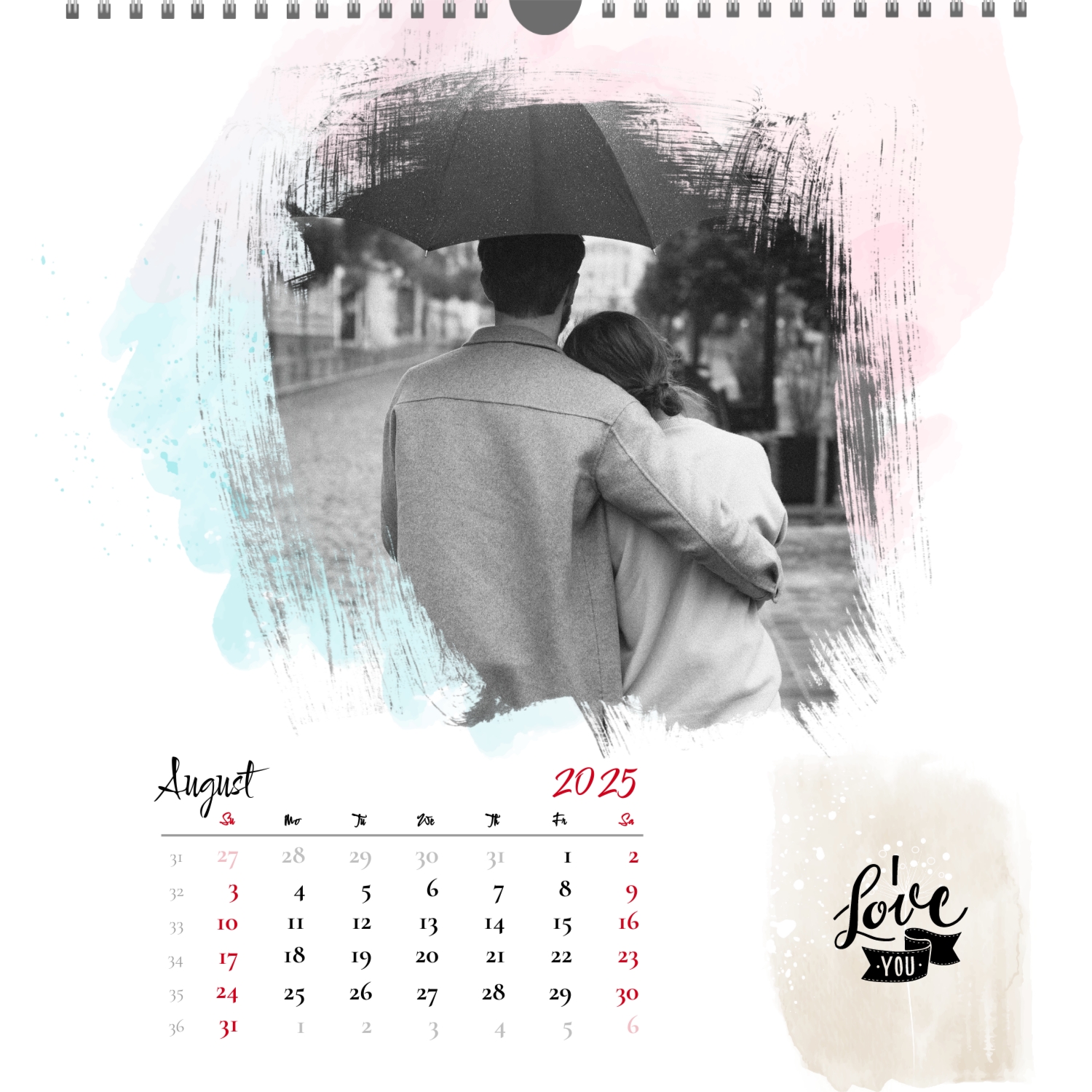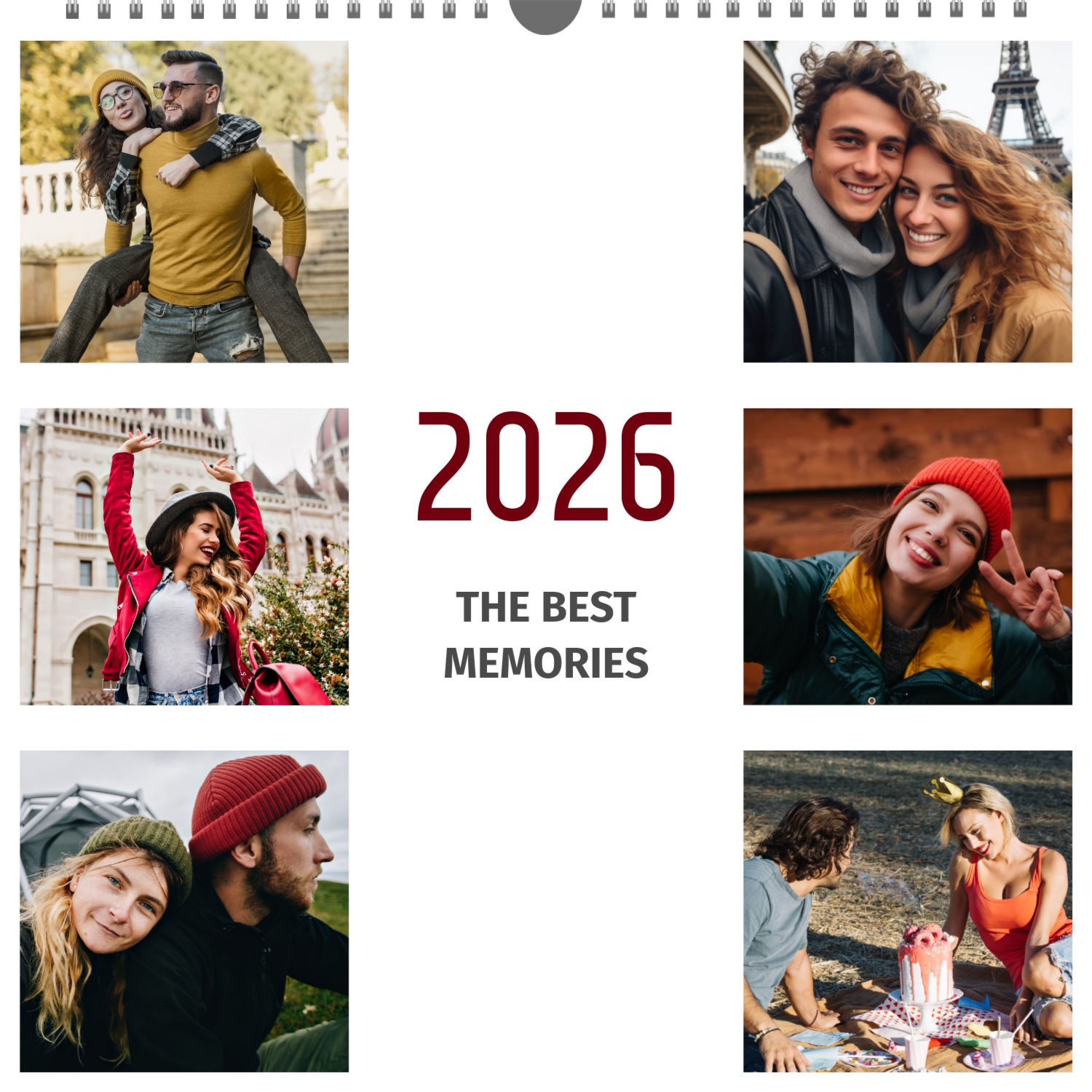 A ready–made wall calendar template for a couple in love is the perfect way to create a unique and touching gift. It has a romantic design that highlights the special bond between the partners. Such a square wall calendar can become not only a pleasant souvenir, but also a stylish interior element. This template is great for photographers specializing in love story, as it can be used to create beautiful professional images. It will also be useful for designers and bloggers working in the romantic field, and it is also ideal for owners of wedding agencies who want to offer customers an unusual gift. The main advantage of this calendar is the possibility of full personalization in our online calendar builder. You can upload your photos, change the background, add memorable dates, romantic captions, or even funny comments to each month. Thanks to the simple and intuitive interface, editing will take a minimum of time, and the result will delight with personality and high quality. By creating such a calendar with your own hands, you put warmth and care into it, making it really special.