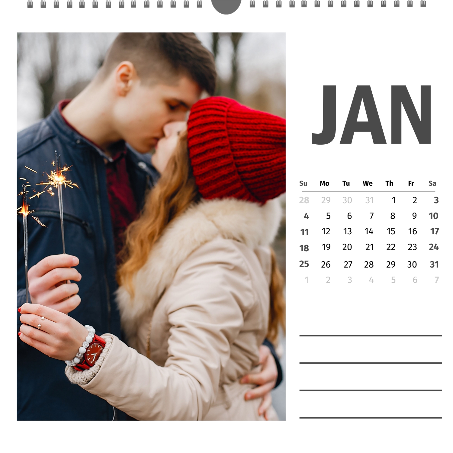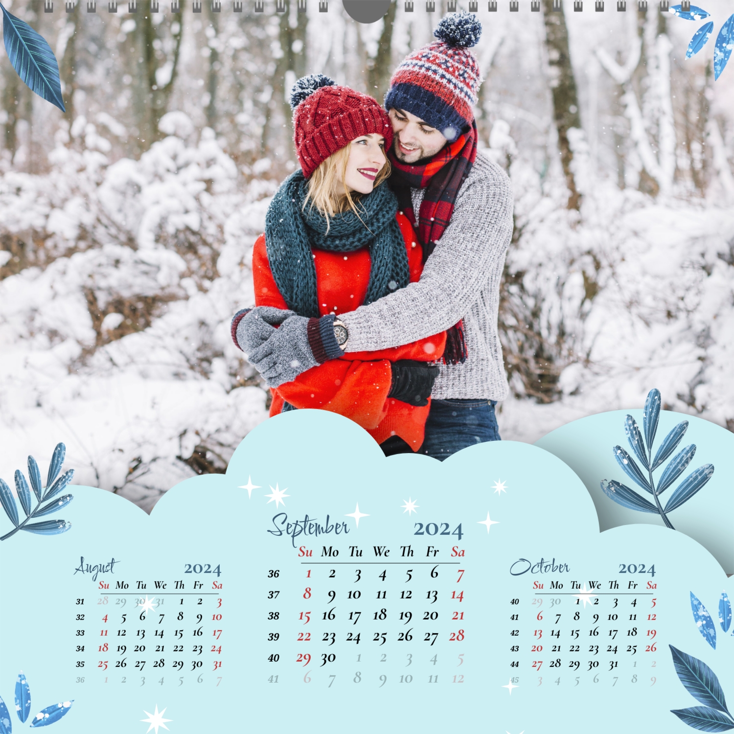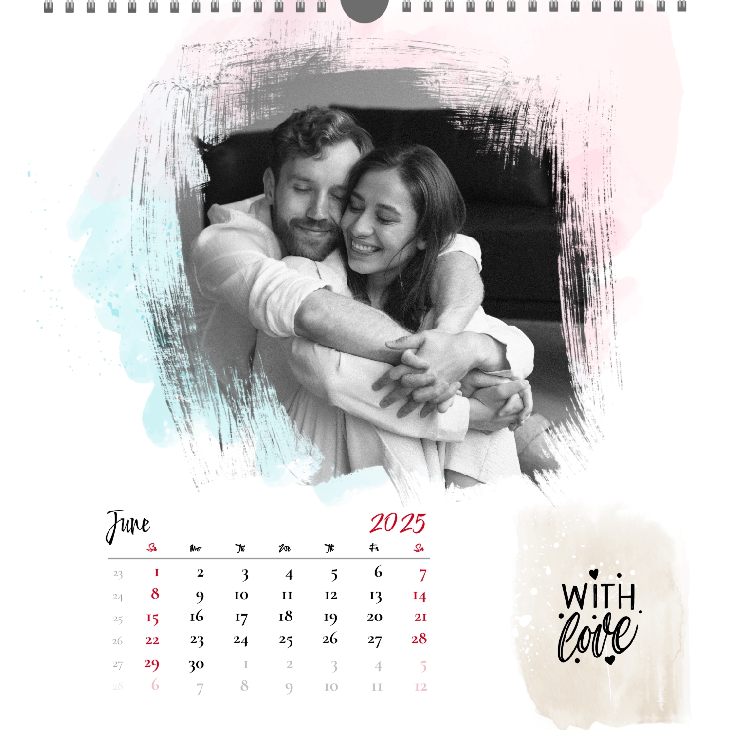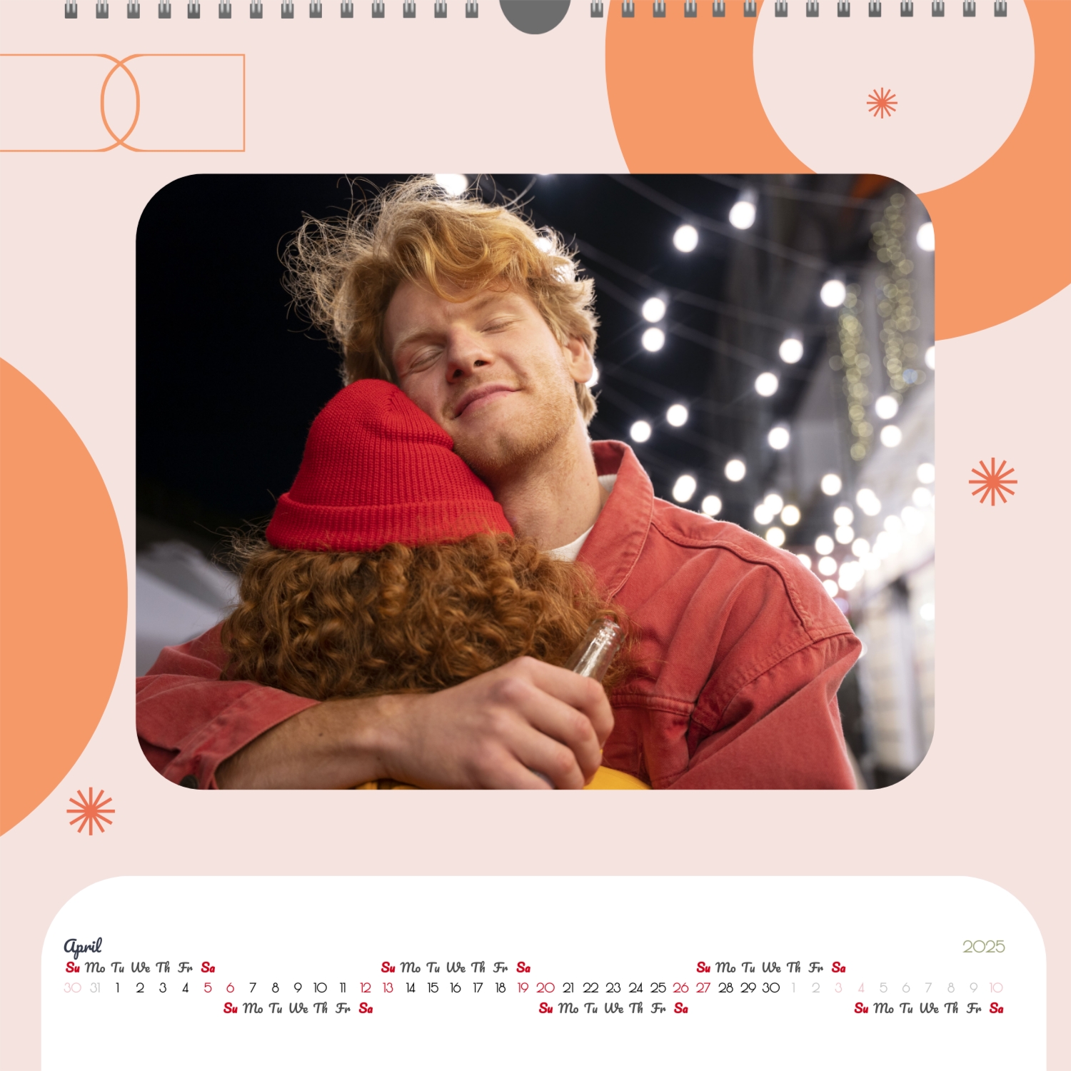 A ready–made wall calendar template for a couple in love is the perfect way to create a unique and touching gift. It has a romantic design that highlights the special bond between the partners. Such a square wall calendar can become not only a pleasant souvenir, but also a stylish interior element. This template is great for photographers specializing in love story, as it can be used to create beautiful professional images. It will also be useful for designers and bloggers working in the romantic field, and it is also ideal for owners of wedding agencies who want to offer customers an unusual gift. The main advantage of this calendar is the possibility of full personalization in our online calendar builder. You can upload your photos, change the background, add memorable dates, romantic captions, or even funny comments to each month. Thanks to the simple and intuitive interface, editing will take a minimum of time, and the result will delight with personality and high quality. By creating such a calendar with your own hands, you put warmth and care into it, making it really special.
