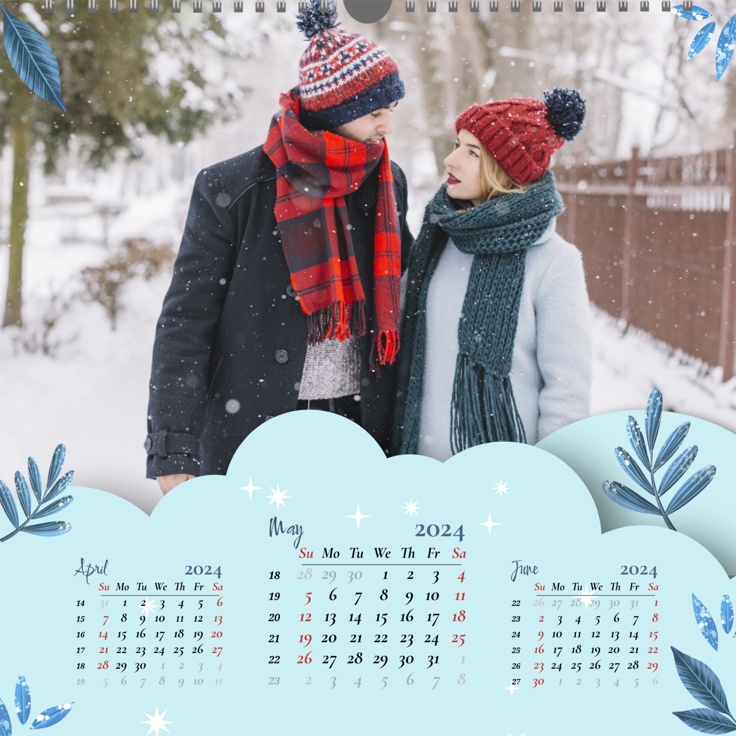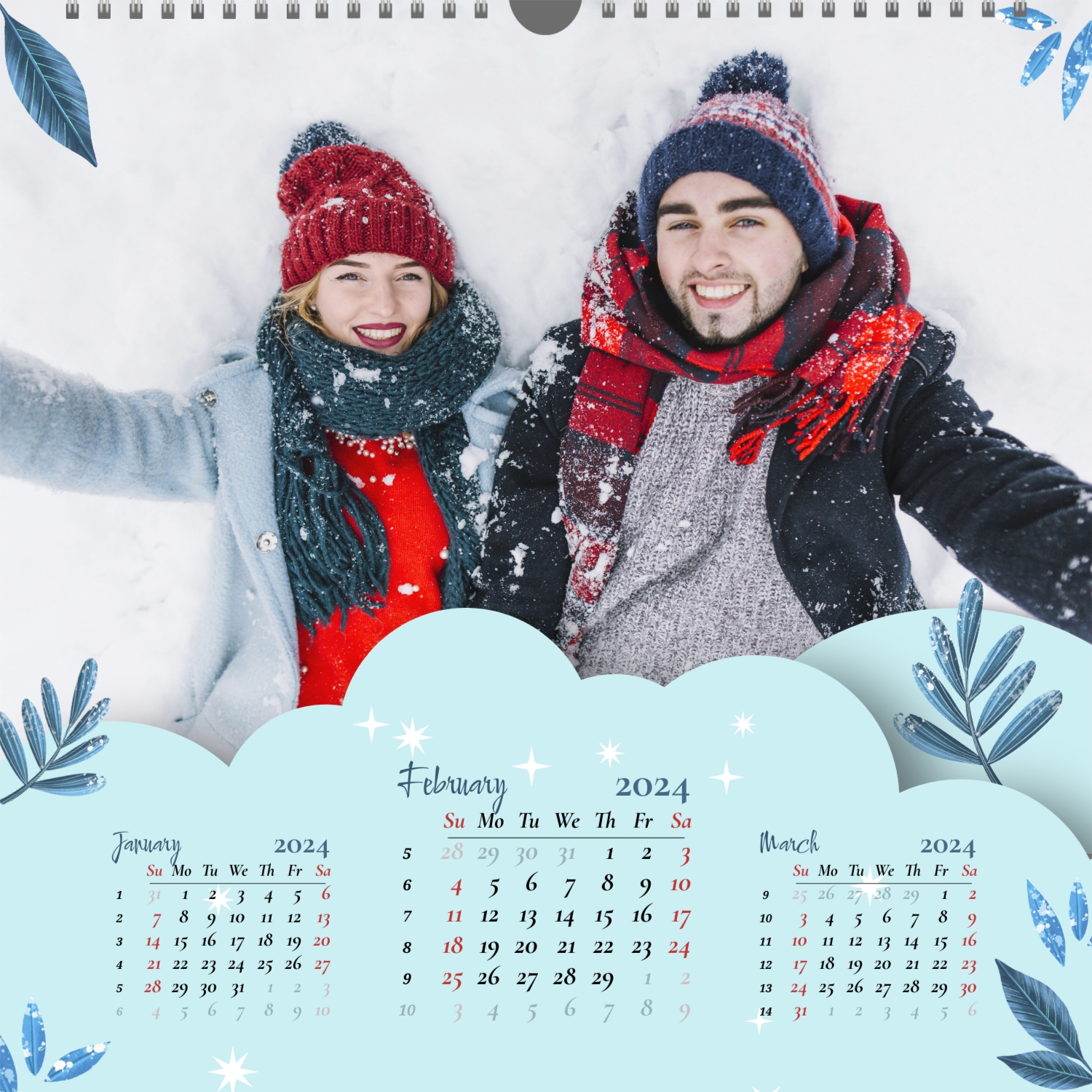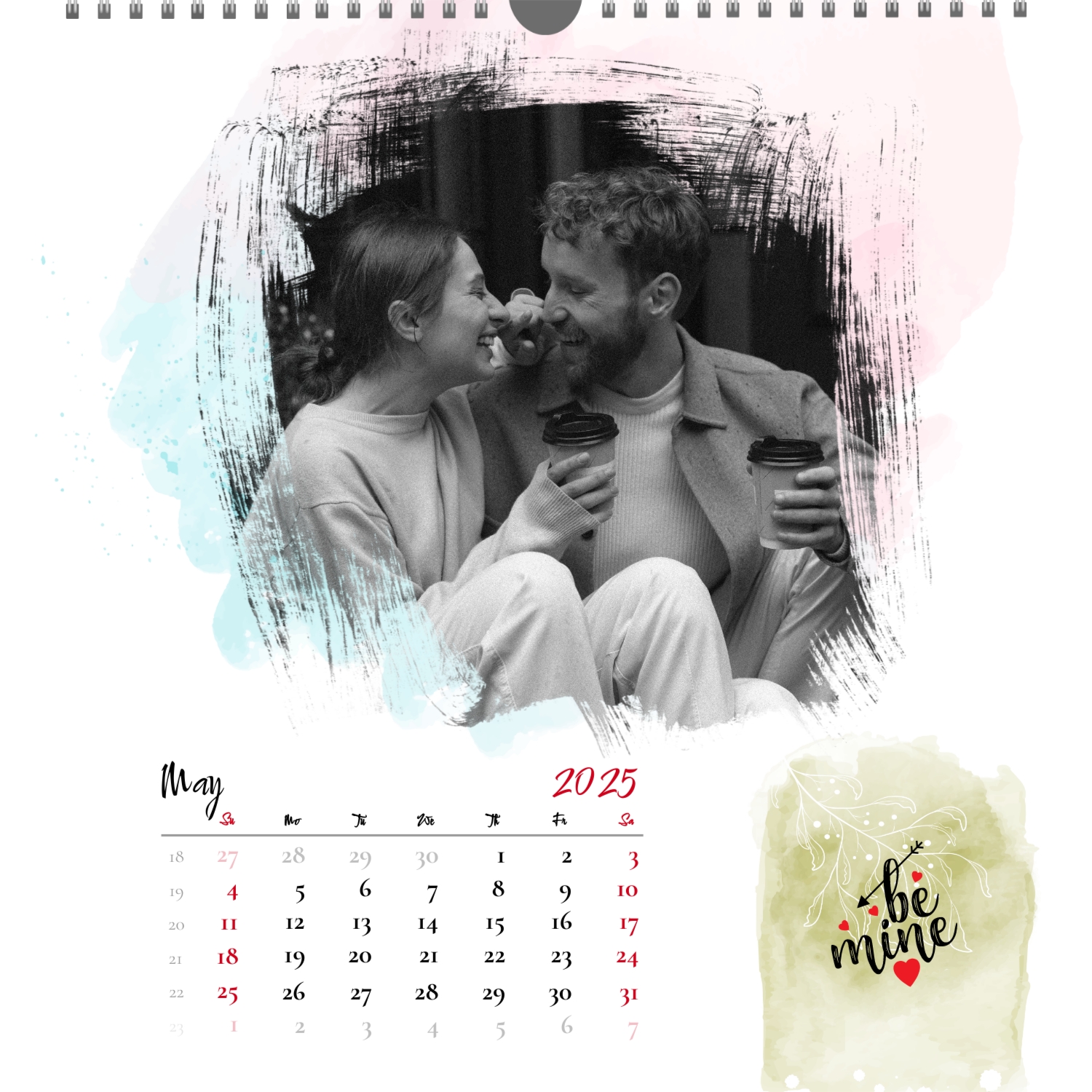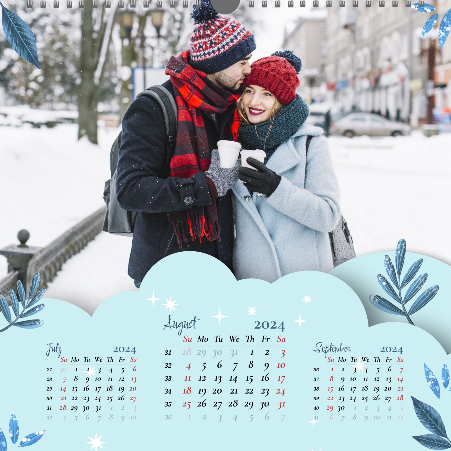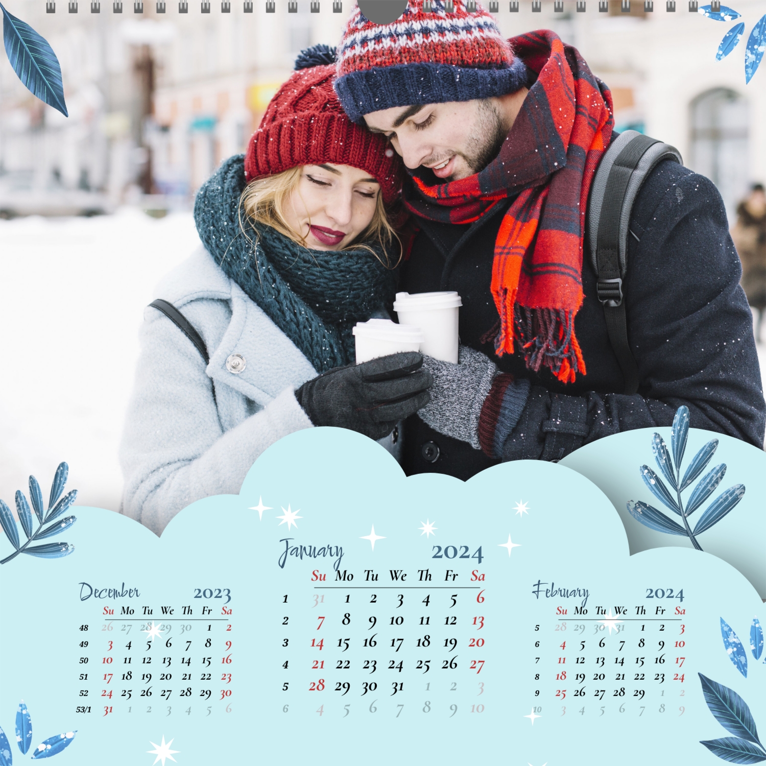 A ready–made wall calendar template for a couple in love is the perfect way to create a unique and touching gift. It has a romantic design that highlights the special bond between the partners. Such a square wall calendar can become not only a pleasant souvenir, but also a stylish interior element. This template is great for photographers specializing in love story, as it can be used to create beautiful professional images. It will also be useful for designers and bloggers working in the romantic field, and it is also ideal for owners of wedding agencies who want to offer customers an unusual gift. The main advantage of this calendar is the possibility of full personalization in our online calendar builder. You can upload your photos, change the background, add memorable dates, romantic captions, or even funny comments to each month. Thanks to the simple and intuitive interface, editing will take a minimum of time, and the result will delight with personality and high quality. By creating such a calendar with your own hands, you put warmth and care into it, making it really special.