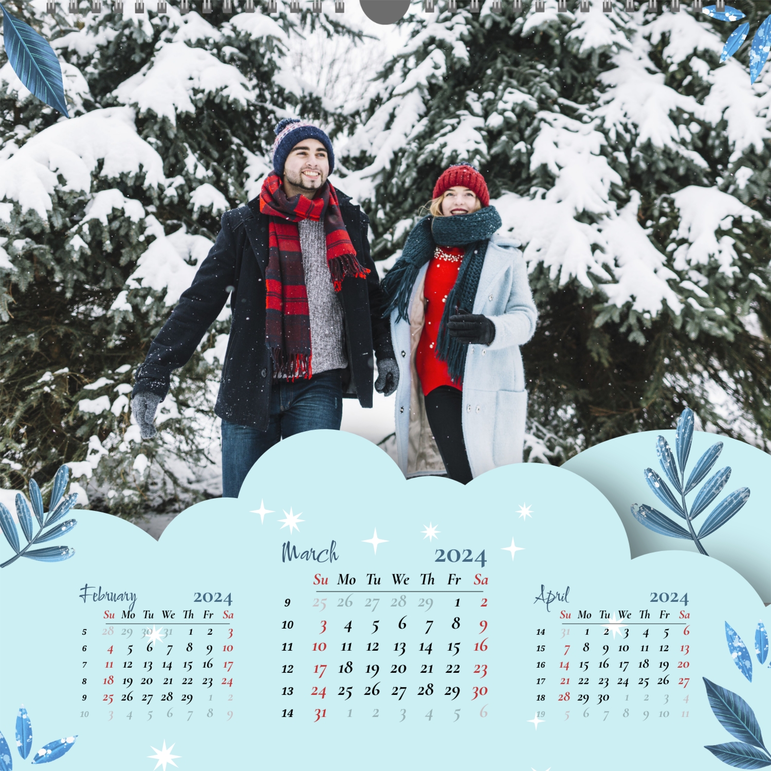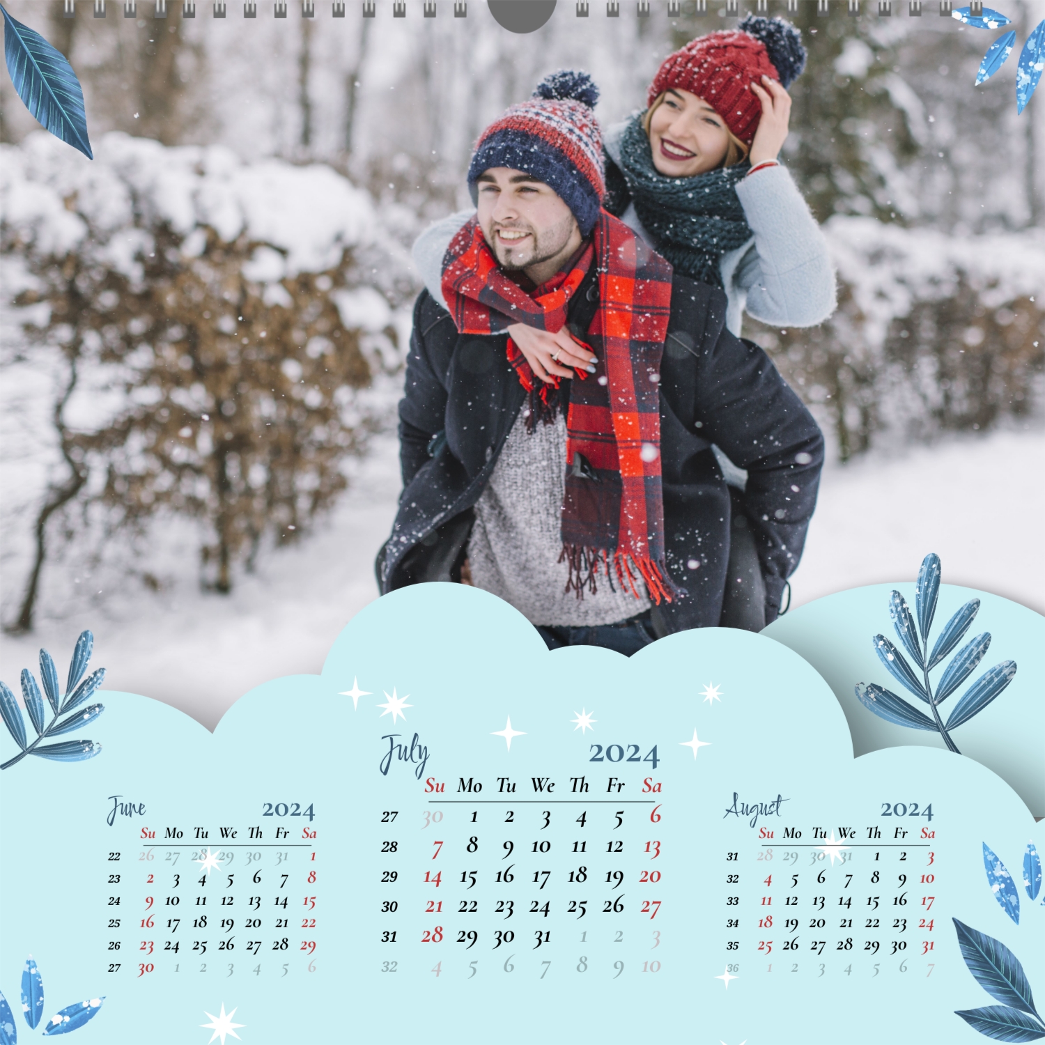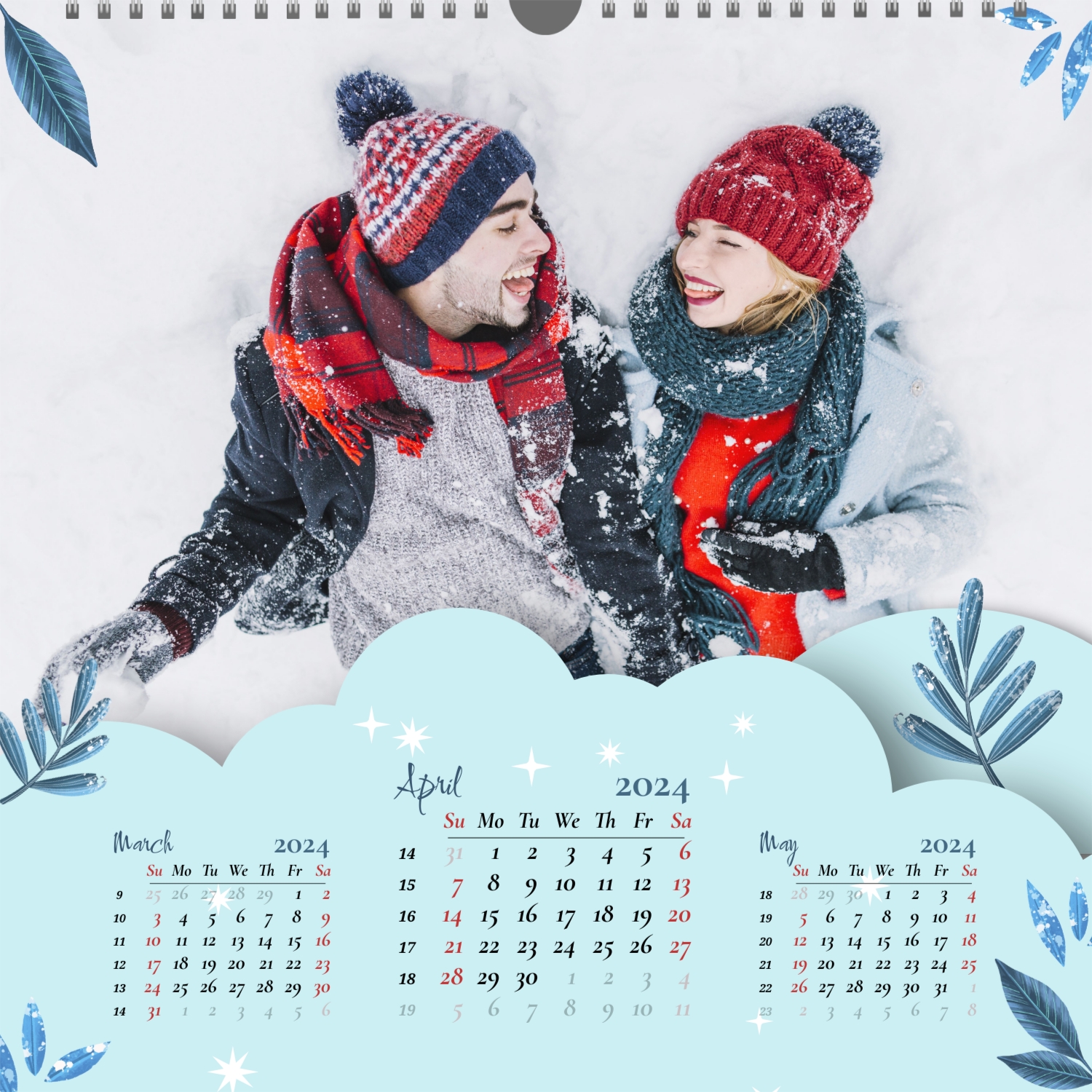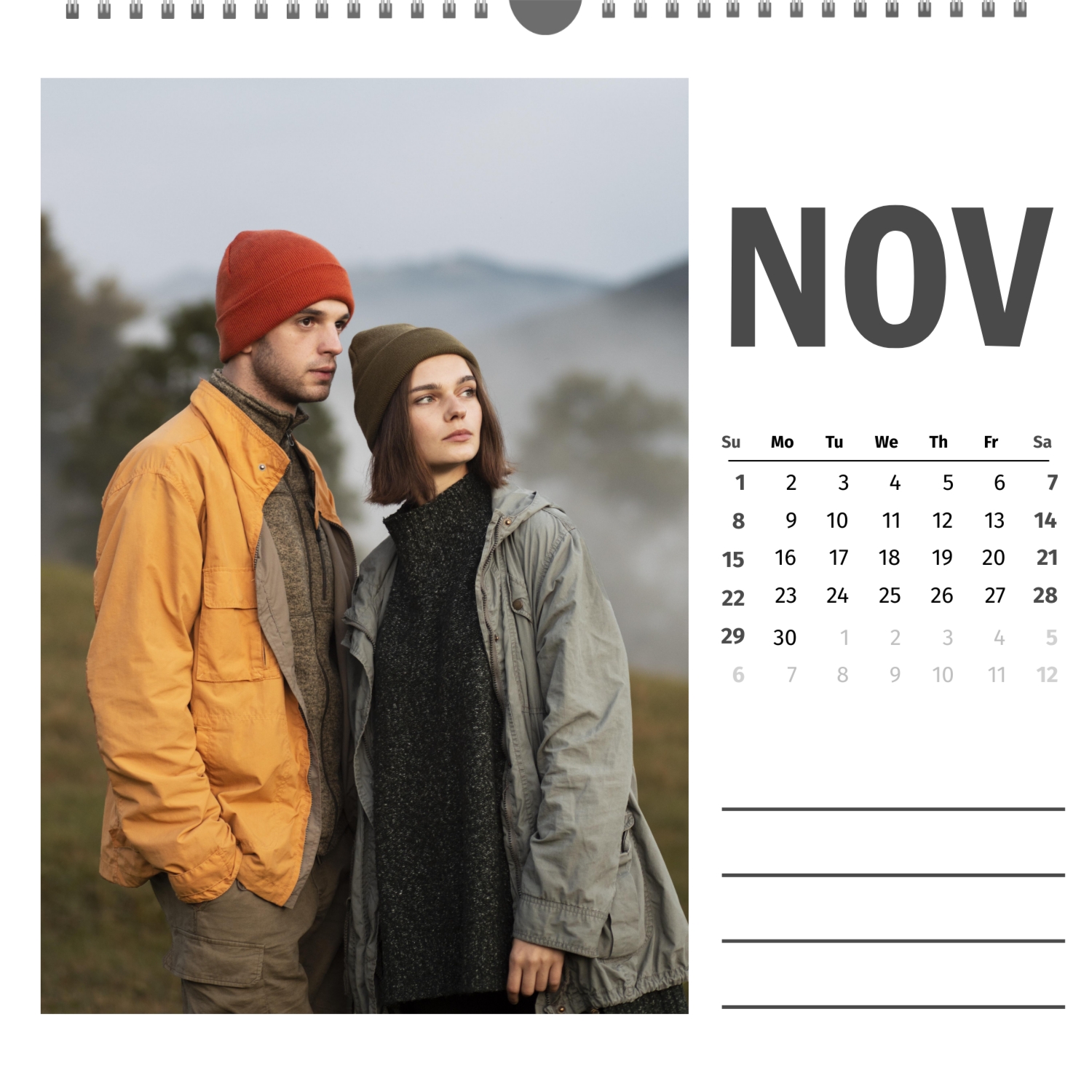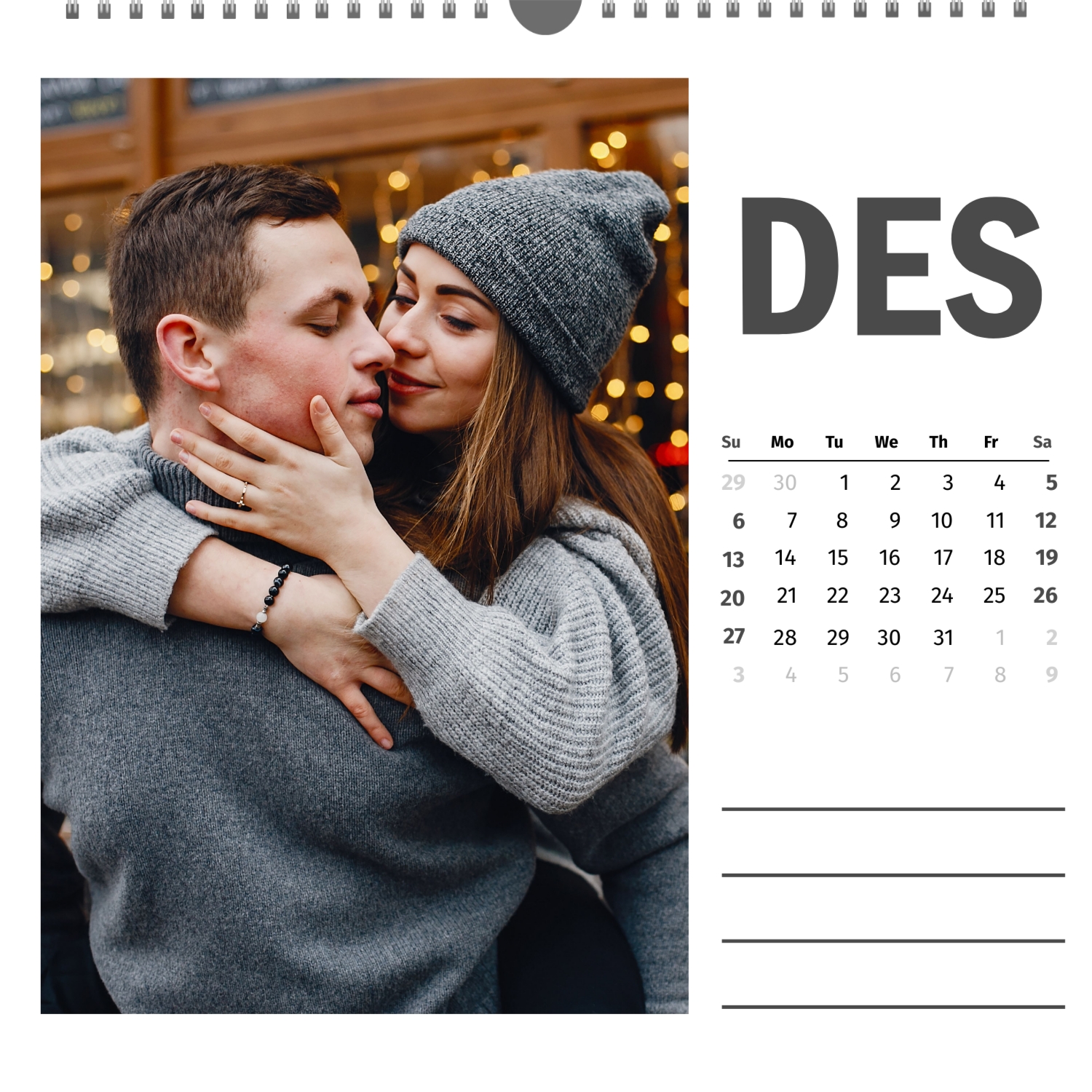 A ready–made wall calendar template for a couple in love is the perfect way to create a unique and touching gift. It has a romantic design that highlights the special bond between the partners. Such a square wall calendar can become not only a pleasant souvenir, but also a stylish interior element. This template is great for photographers specializing in love story, as it can be used to create beautiful professional images. It will also be useful for designers and bloggers working in the romantic field, and it is also ideal for owners of wedding agencies who want to offer customers an unusual gift. The main advantage of this calendar is the possibility of full personalization in our online calendar builder. You can upload your photos, change the background, add memorable dates, romantic captions, or even funny comments to each month. Thanks to the simple and intuitive interface, editing will take a minimum of time, and the result will delight with personality and high quality. By creating such a calendar with your own hands, you put warmth and care into it, making it really special.