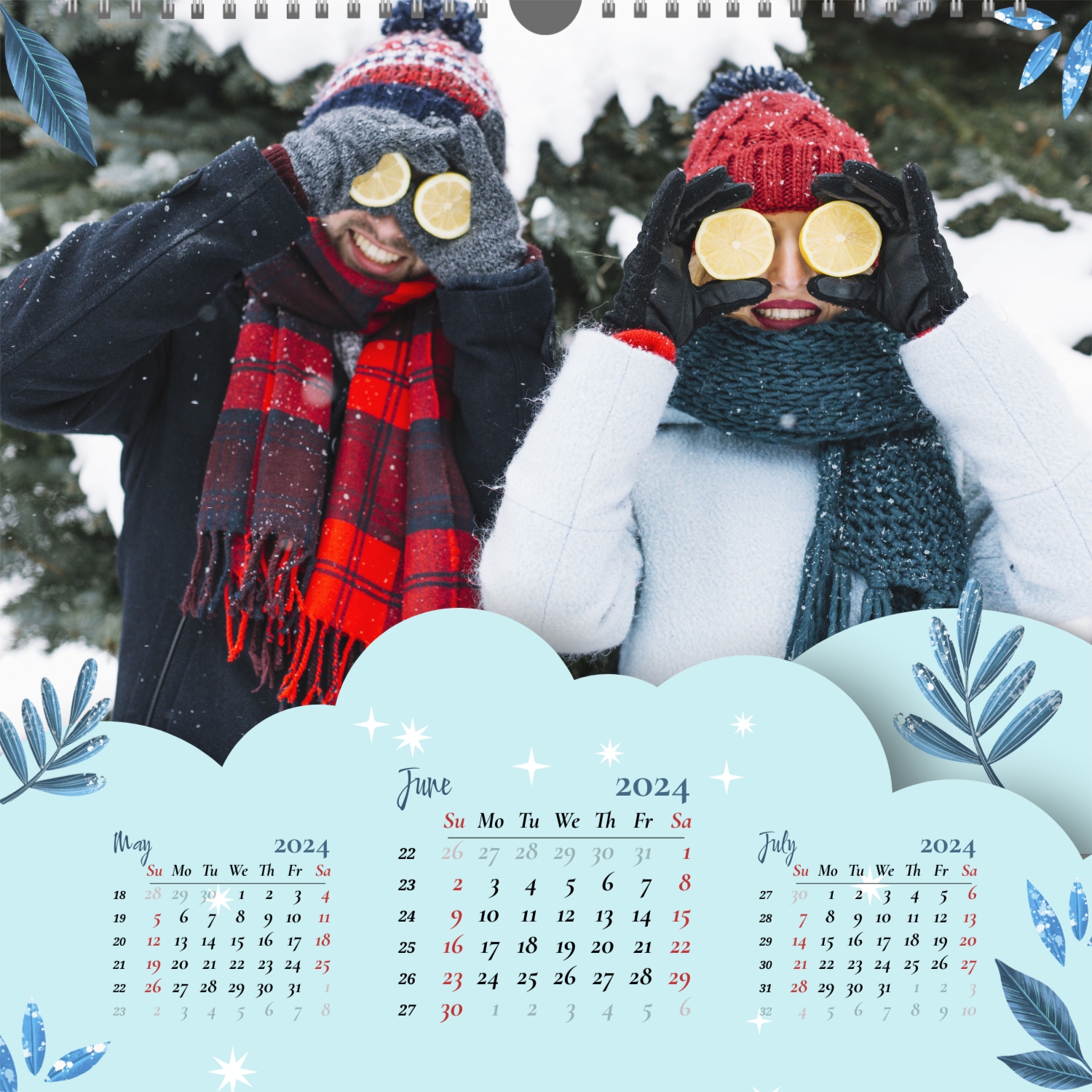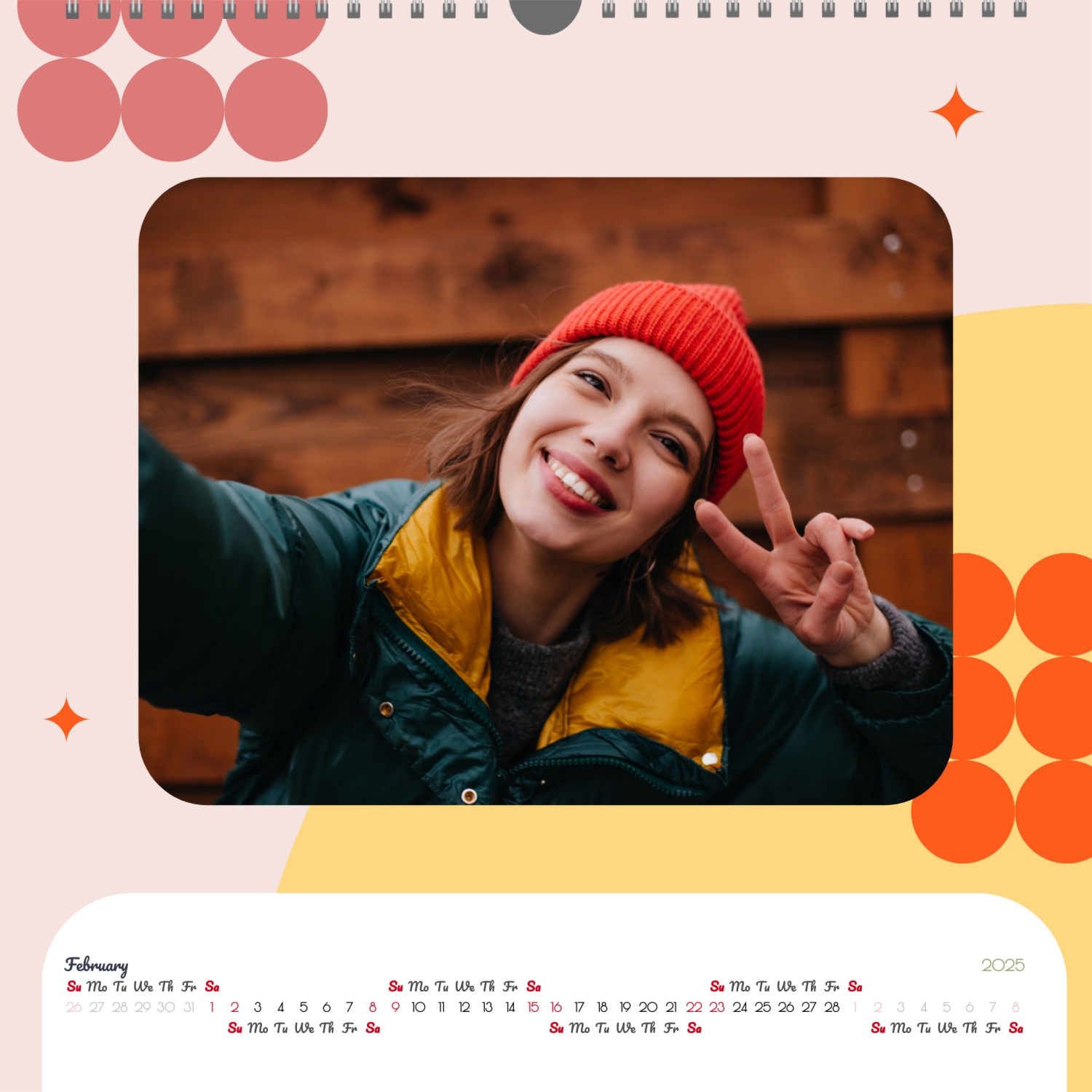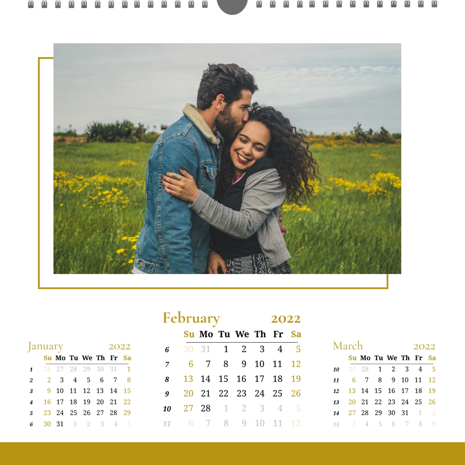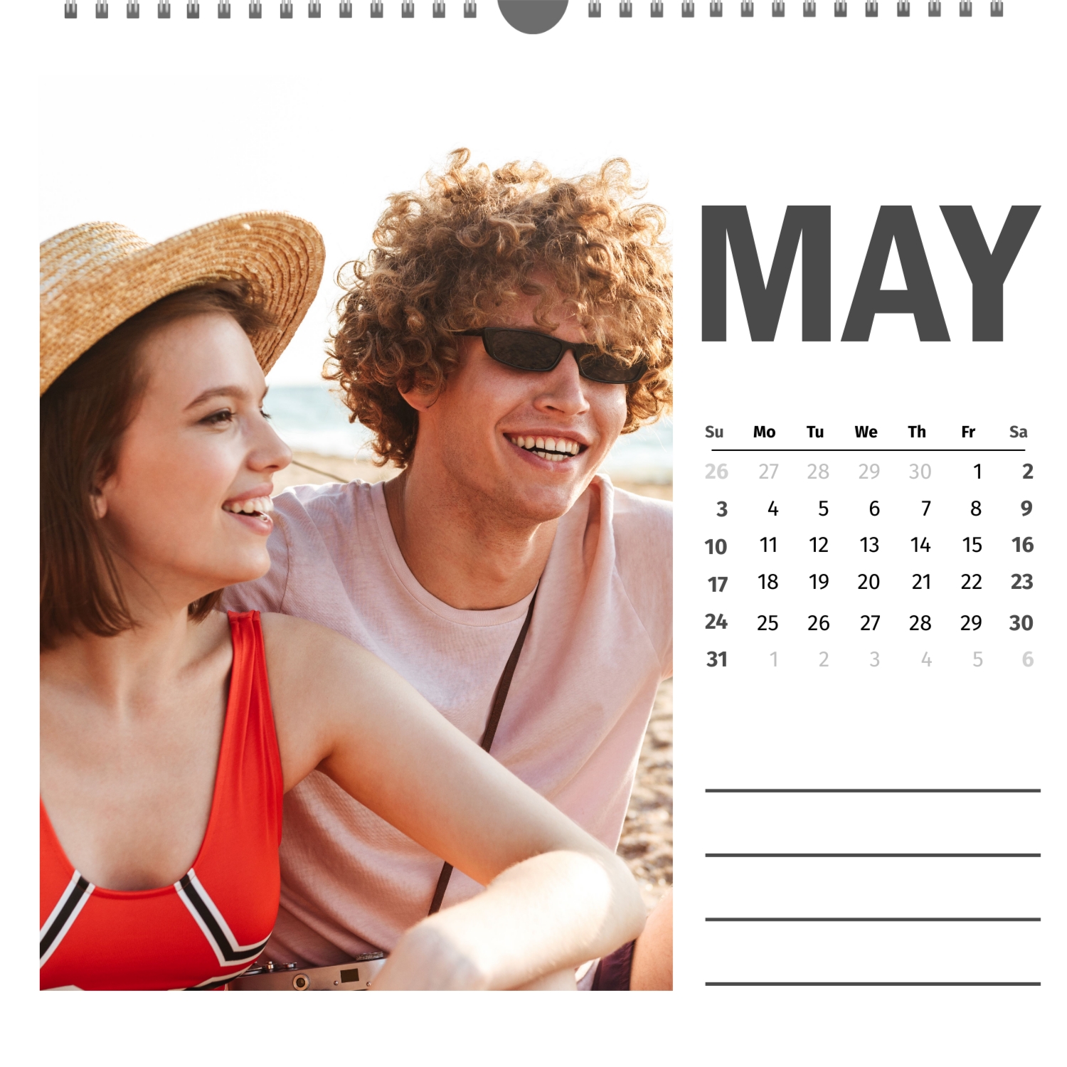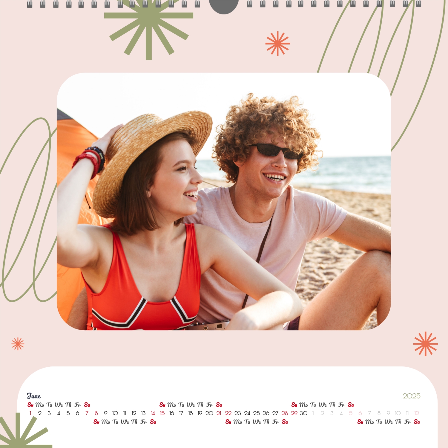 A ready–made wall calendar template for a couple in love is the perfect way to create a unique and touching gift. It has a romantic design that highlights the special bond between the partners. Such a square wall calendar can become not only a pleasant souvenir, but also a stylish interior element. This template is great for photographers specializing in love story, as it can be used to create beautiful professional images. It will also be useful for designers and bloggers working in the romantic field, and it is also ideal for owners of wedding agencies who want to offer customers an unusual gift. The main advantage of this calendar is the possibility of full personalization in our online calendar builder. You can upload your photos, change the background, add memorable dates, romantic captions, or even funny comments to each month. Thanks to the simple and intuitive interface, editing will take a minimum of time, and the result will delight with personality and high quality. By creating such a calendar with your own hands, you put warmth and care into it, making it really special.