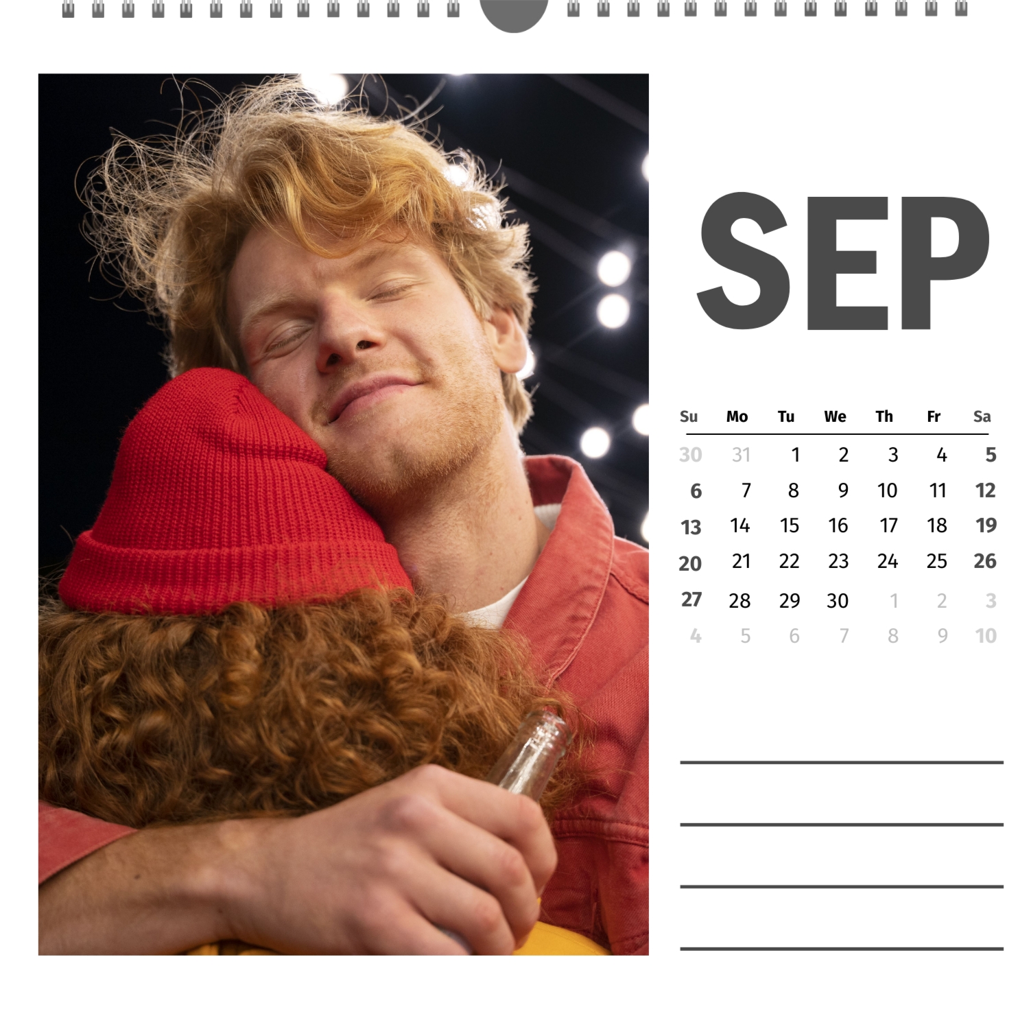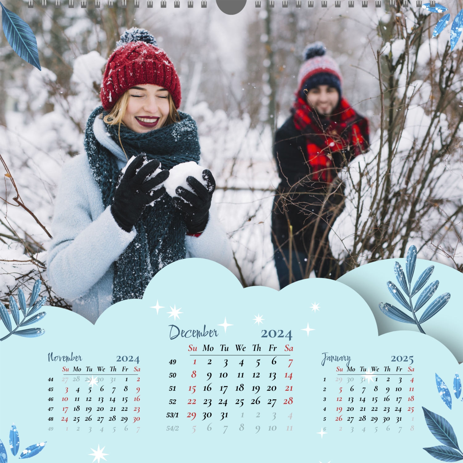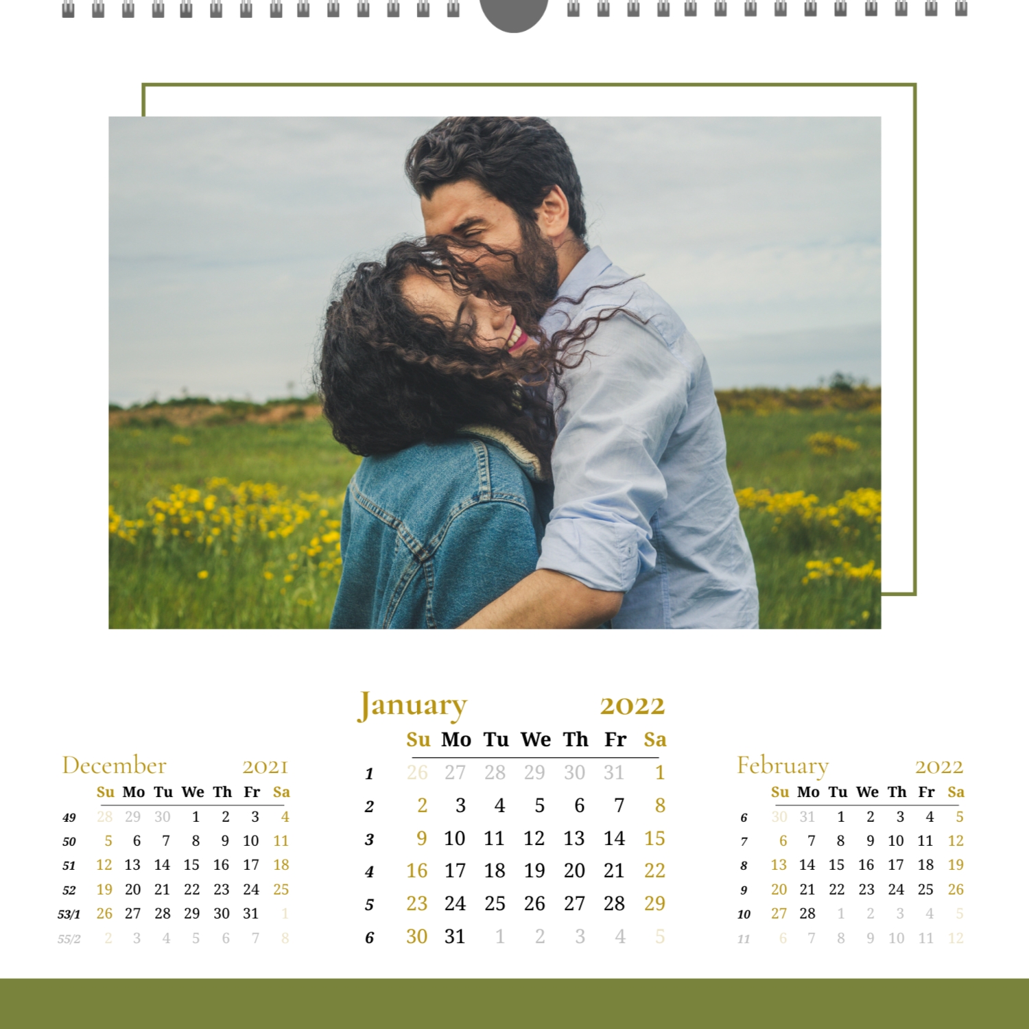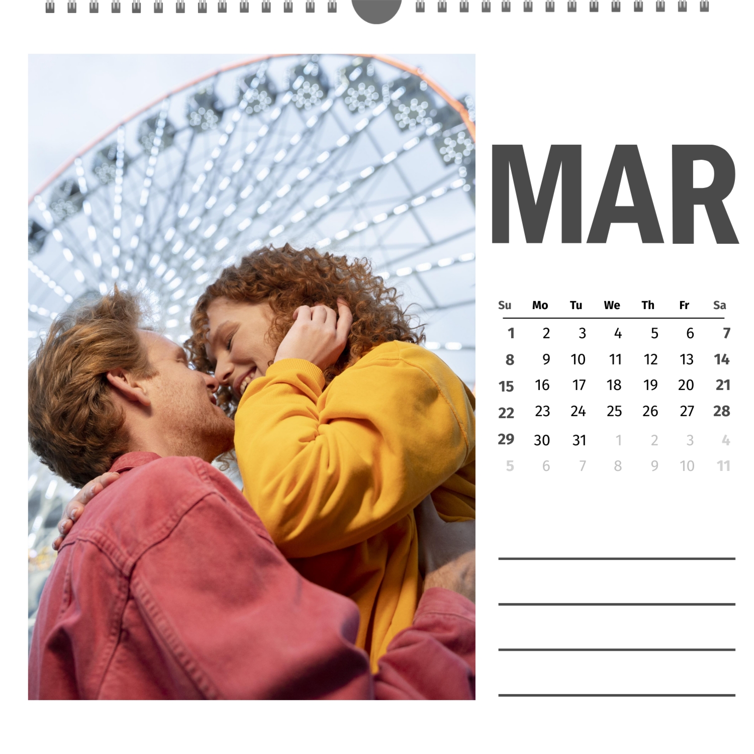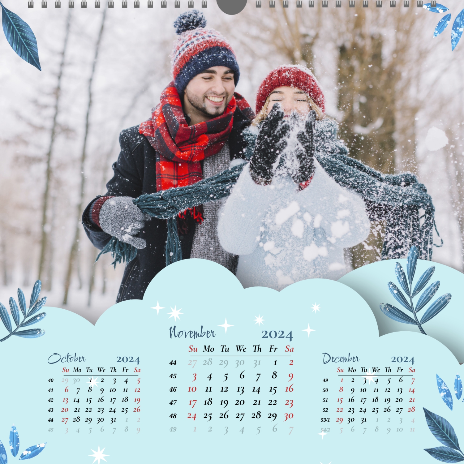 A ready–made wall calendar template for a couple in love is the perfect way to create a unique and touching gift. It has a romantic design that highlights the special bond between the partners. Such a square wall calendar can become not only a pleasant souvenir, but also a stylish interior element. This template is great for photographers specializing in love story, as it can be used to create beautiful professional images. It will also be useful for designers and bloggers working in the romantic field, and it is also ideal for owners of wedding agencies who want to offer customers an unusual gift. The main advantage of this calendar is the possibility of full personalization in our online calendar builder. You can upload your photos, change the background, add memorable dates, romantic captions, or even funny comments to each month. Thanks to the simple and intuitive interface, editing will take a minimum of time, and the result will delight with personality and high quality. By creating such a calendar with your own hands, you put warmth and care into it, making it really special.