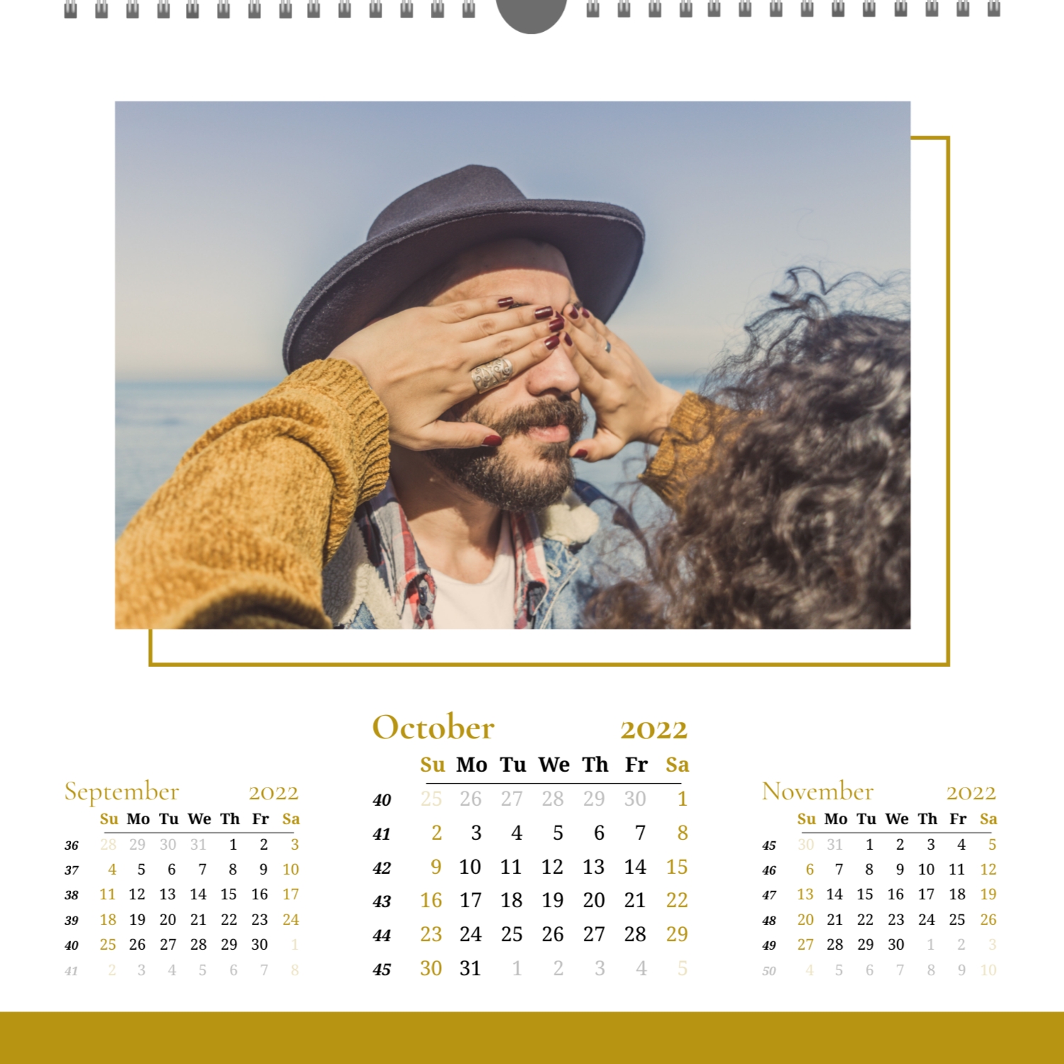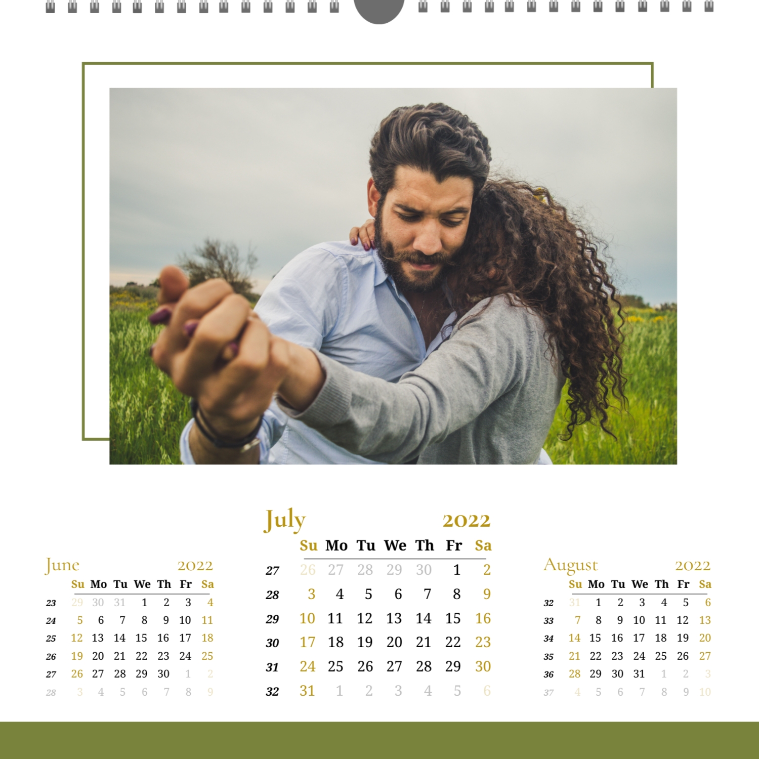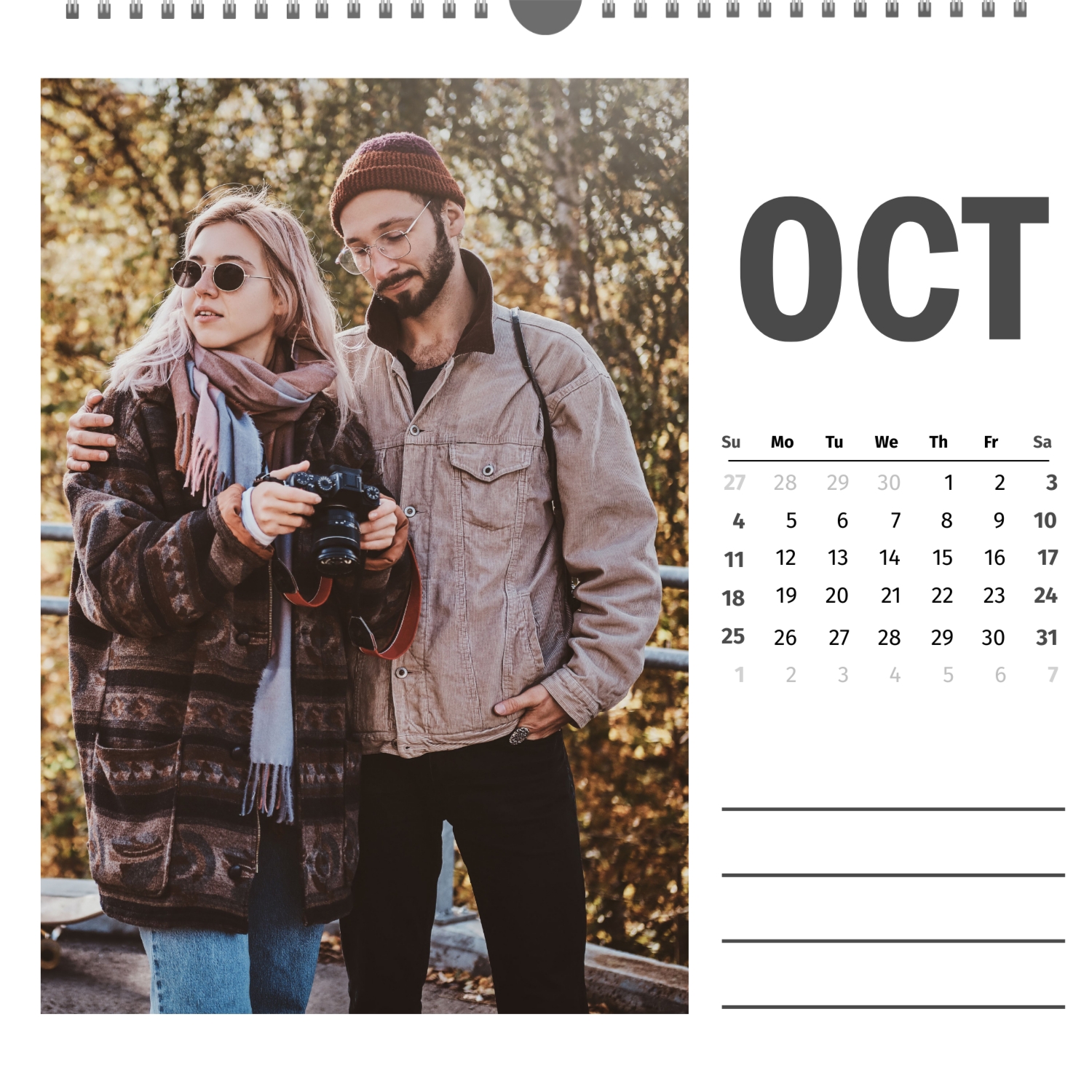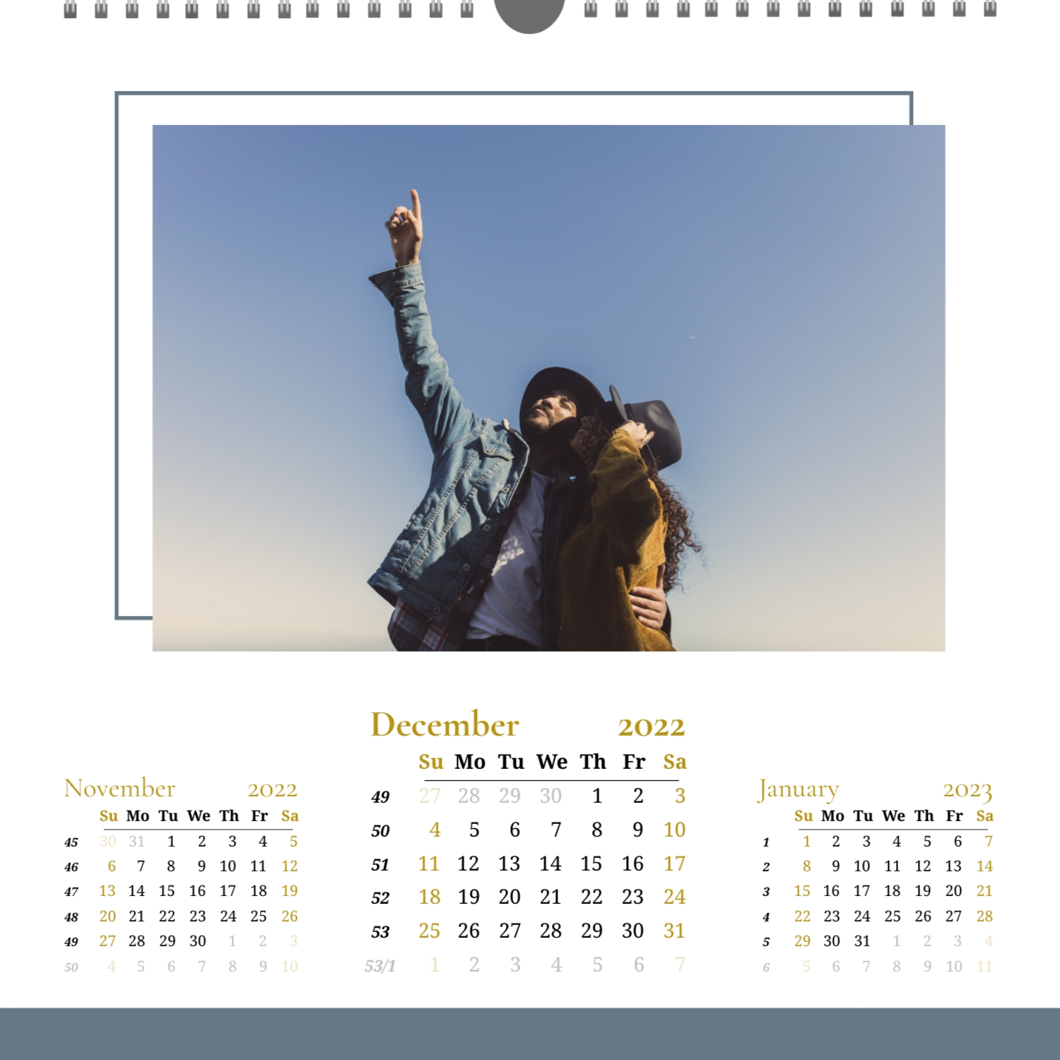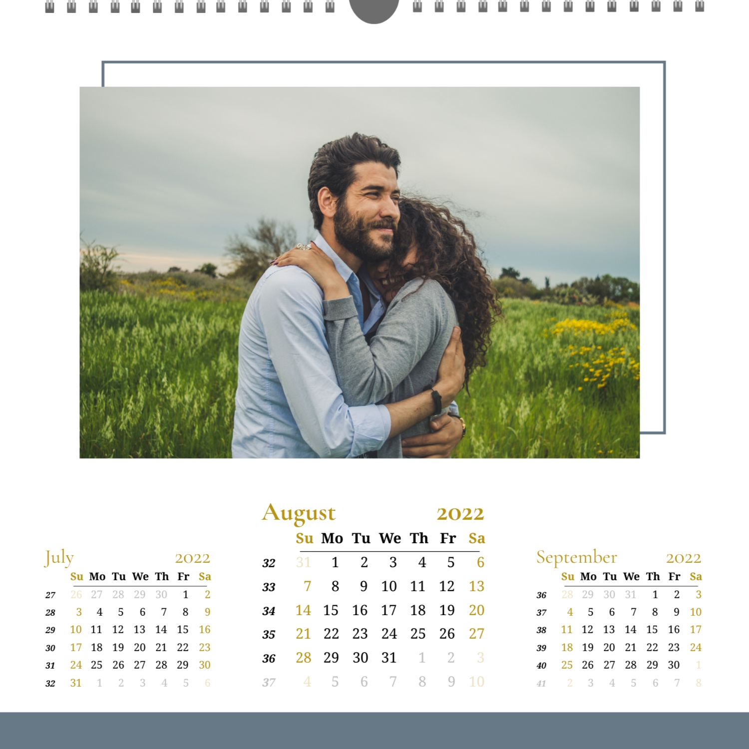 A ready–made wall calendar template for a couple in love is the perfect way to create a unique and touching gift. It has a romantic design that highlights the special bond between the partners. Such a square wall calendar can become not only a pleasant souvenir, but also a stylish interior element. This template is great for photographers specializing in love story, as it can be used to create beautiful professional images. It will also be useful for designers and bloggers working in the romantic field, and it is also ideal for owners of wedding agencies who want to offer customers an unusual gift. The main advantage of this calendar is the possibility of full personalization in our online calendar builder. You can upload your photos, change the background, add memorable dates, romantic captions, or even funny comments to each month. Thanks to the simple and intuitive interface, editing will take a minimum of time, and the result will delight with personality and high quality. By creating such a calendar with your own hands, you put warmth and care into it, making it really special.