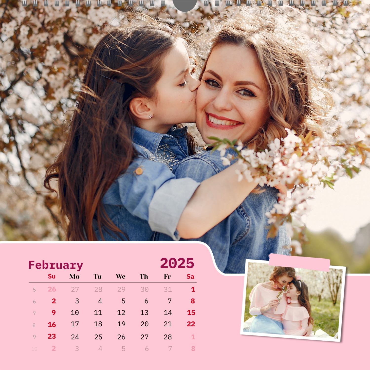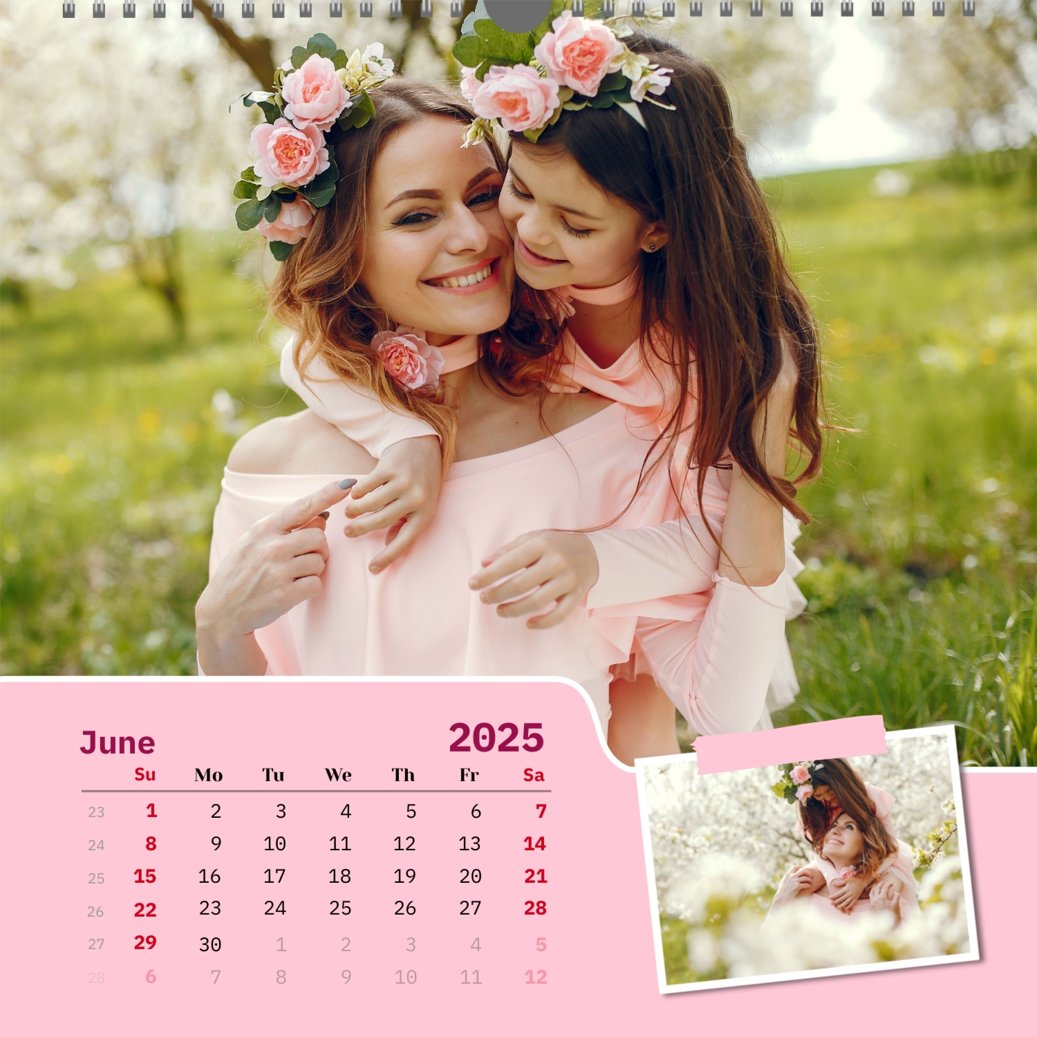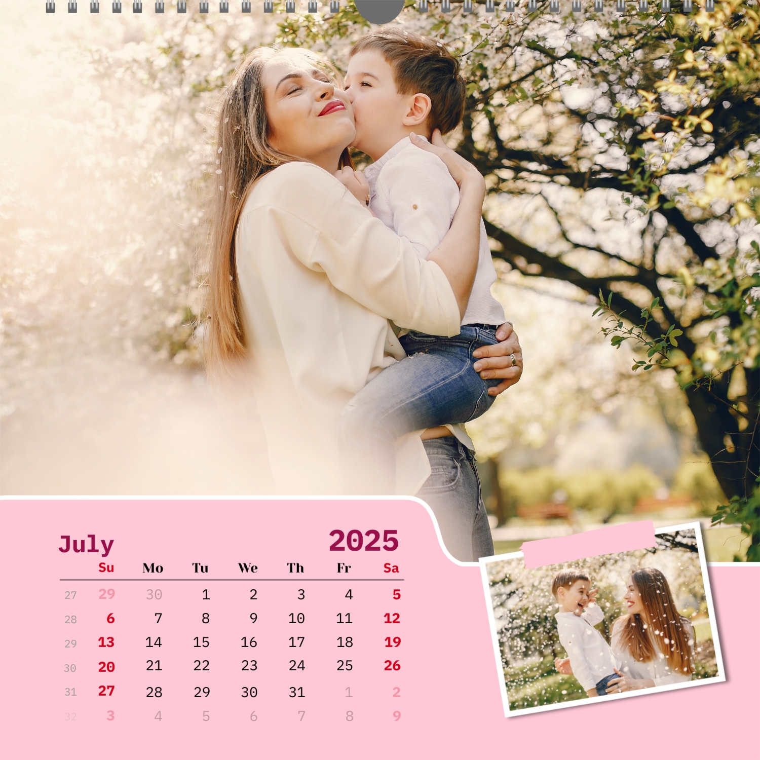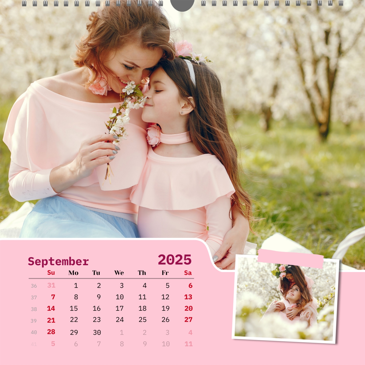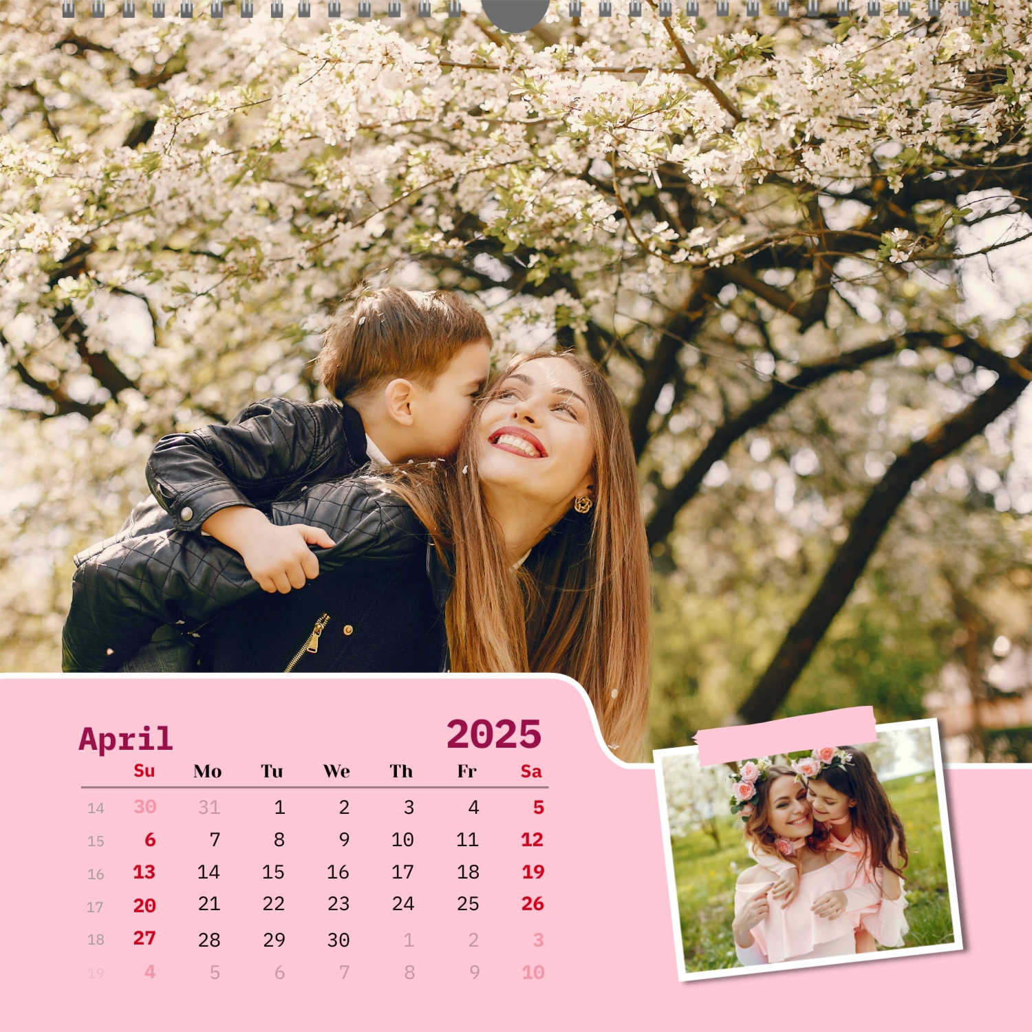 The ready—made square wall calendar template "Mama's Love" is a touching and gentle design filled with warmth, care and comfort. It is decorated in soft pastel colors with elements symbolizing maternal affection: hearts, children's drawings, floral motifs. This calendar is ideal for family photo shoots, Mother's Day gifts, and will also be an excellent solution for professionals working in the field of child development, family psychology, pedagogy, and preschool education. It can be used in kindergartens, early development centers, private photo studios, as well as in charitable organizations that help families. In the online ad builder, this template can be easily adapted to any format and content. All elements are editable: you can upload your own photos, change the labels, choose the font and its color, adjust the location of the months, add important dates and events. Thanks to the flexible settings, the calendar can easily be turned into a personal gift or a professional tool, for example, a branded calendar with the logo and contacts of the center.