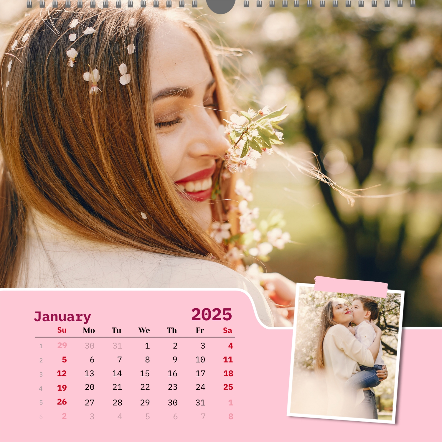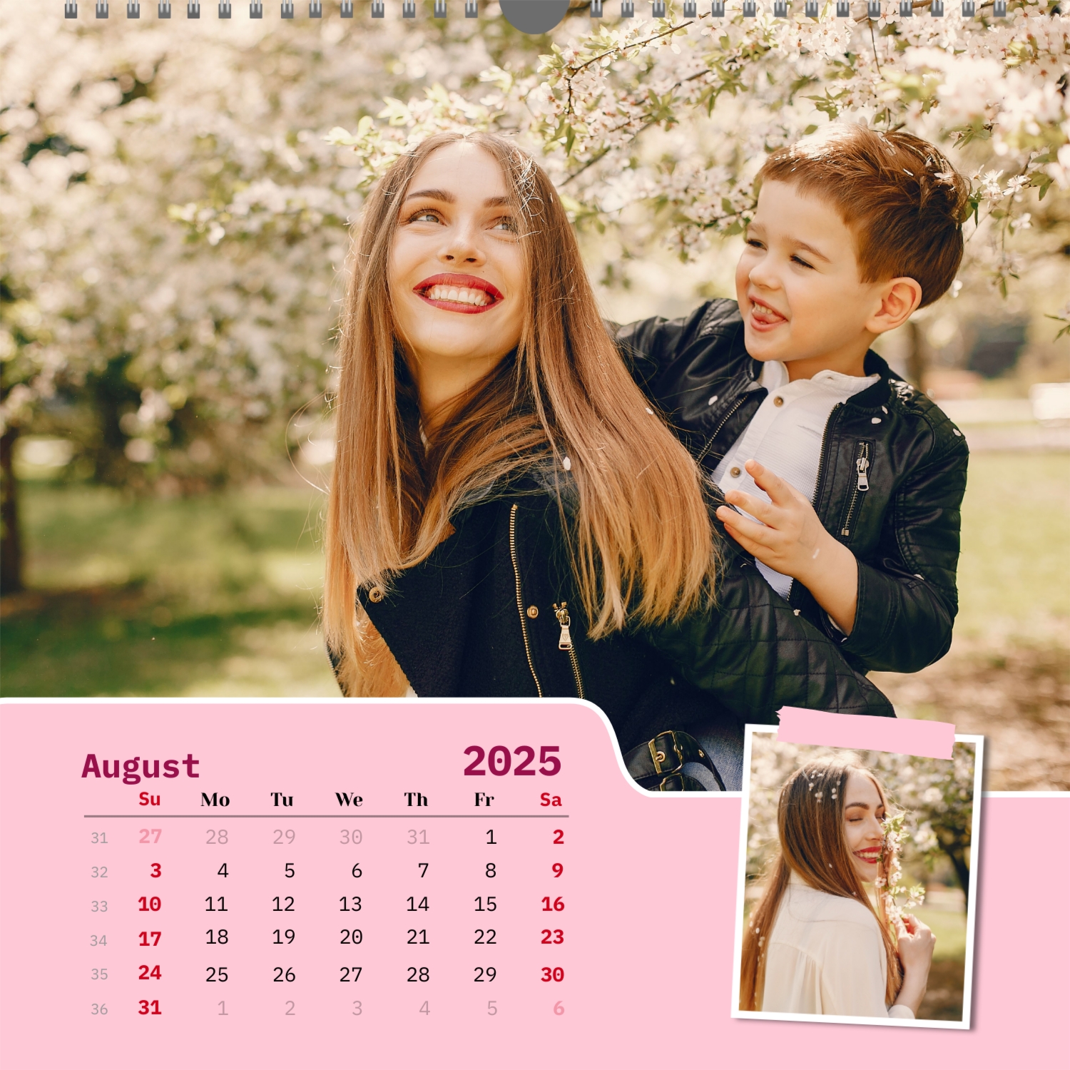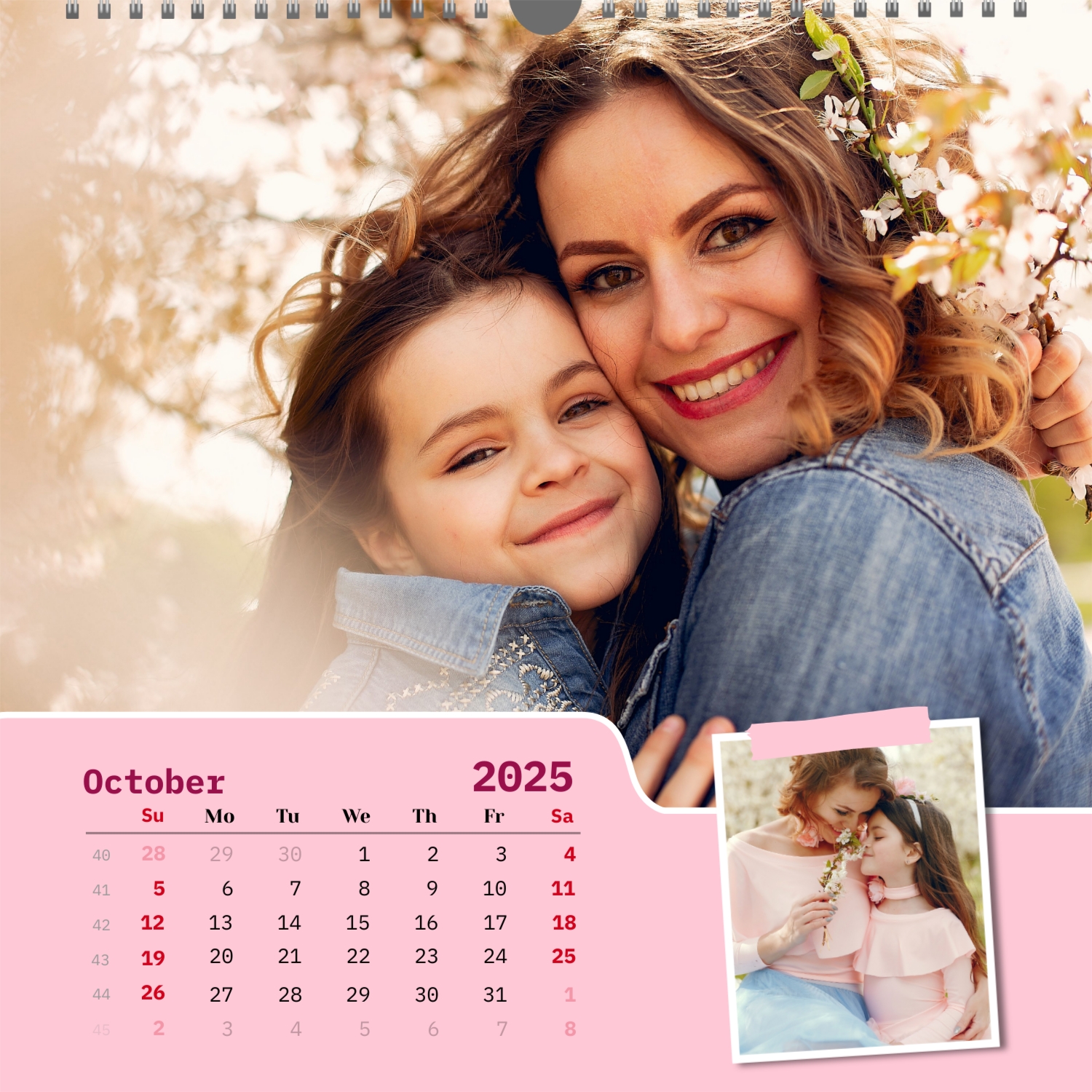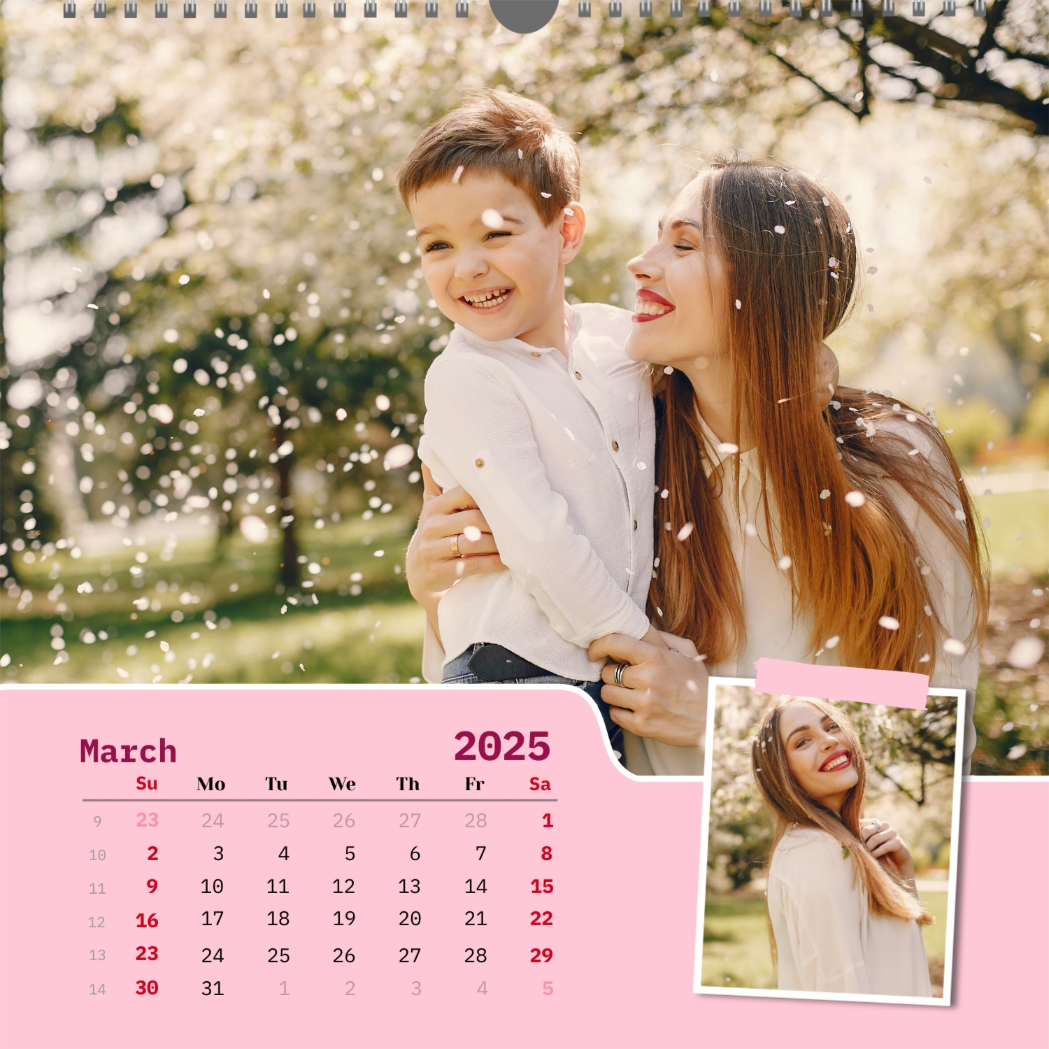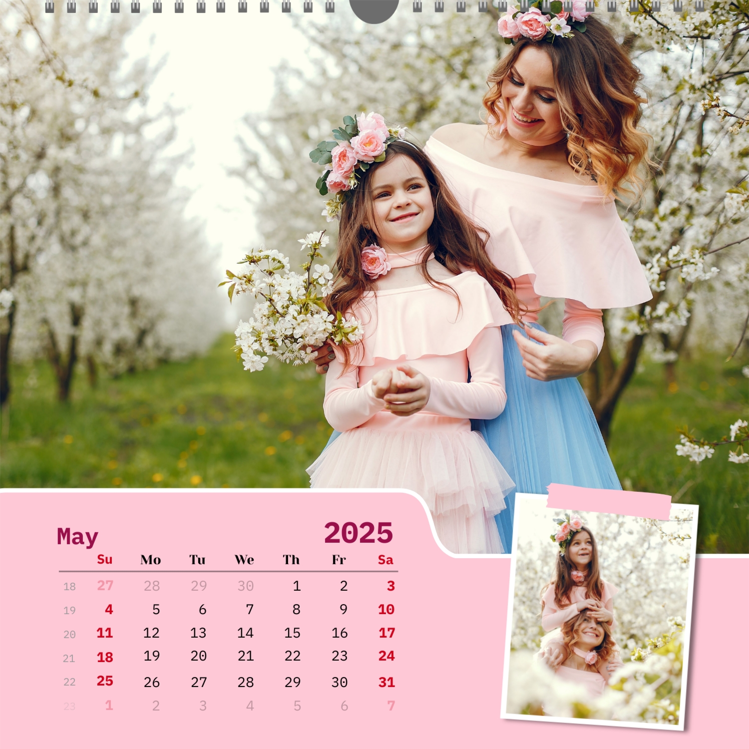 The ready—made square wall calendar template "Mama's Love" is a touching and gentle design filled with warmth, care and comfort. It is decorated in soft pastel colors with elements symbolizing maternal affection: hearts, children's drawings, floral motifs. This calendar is ideal for family photo shoots, Mother's Day gifts, and will also be an excellent solution for professionals working in the field of child development, family psychology, pedagogy, and preschool education. It can be used in kindergartens, early development centers, private photo studios, as well as in charitable organizations that help families. In the online ad builder, this template can be easily adapted to any format and content. All elements are editable: you can upload your own photos, change the labels, choose the font and its color, adjust the location of the months, add important dates and events. Thanks to the flexible settings, the calendar can easily be turned into a personal gift or a professional tool, for example, a branded calendar with the logo and contacts of the center.