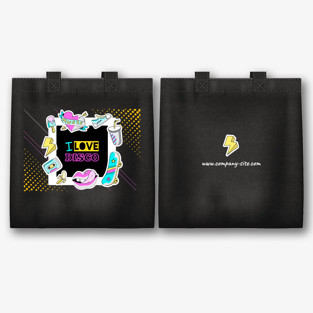 Nemokamas tekstilės krepšio šablonas su muzikanto spauda. Sukurkite išdėstymą su savo rankomis internetiniame ekologinio maišelio dizaineryje.