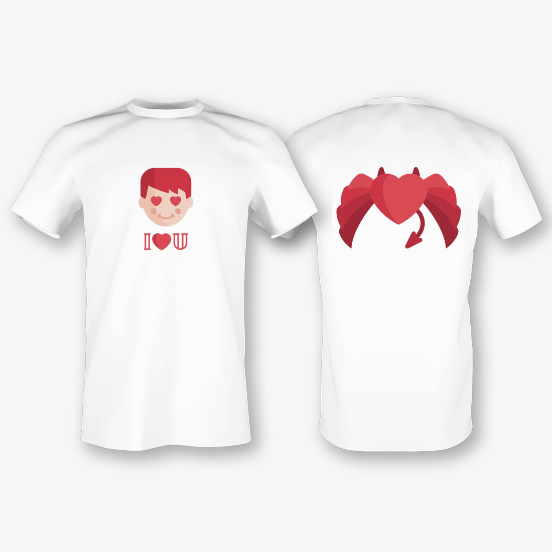 Nemokamas originalių vyriškų marškinėlių su spauda šablonas mėgėjams, jaunavedžiams. Sukurkite išdėstymą su savo rankomis internetiniame marškinėlių ir gaubtų dizaineryje.