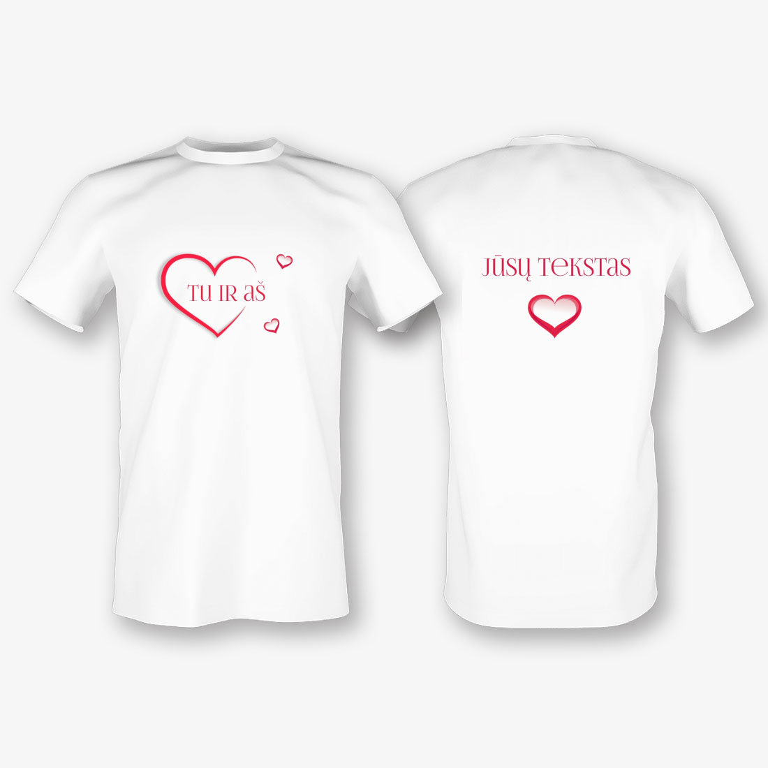 Nemokamas įsimylėjėlių marškinėlių poros šablonas vyrui. Sukurkite išdėstymą su savo rankomis internetiniame marškinėlių ir gaubtų dizaineryje.