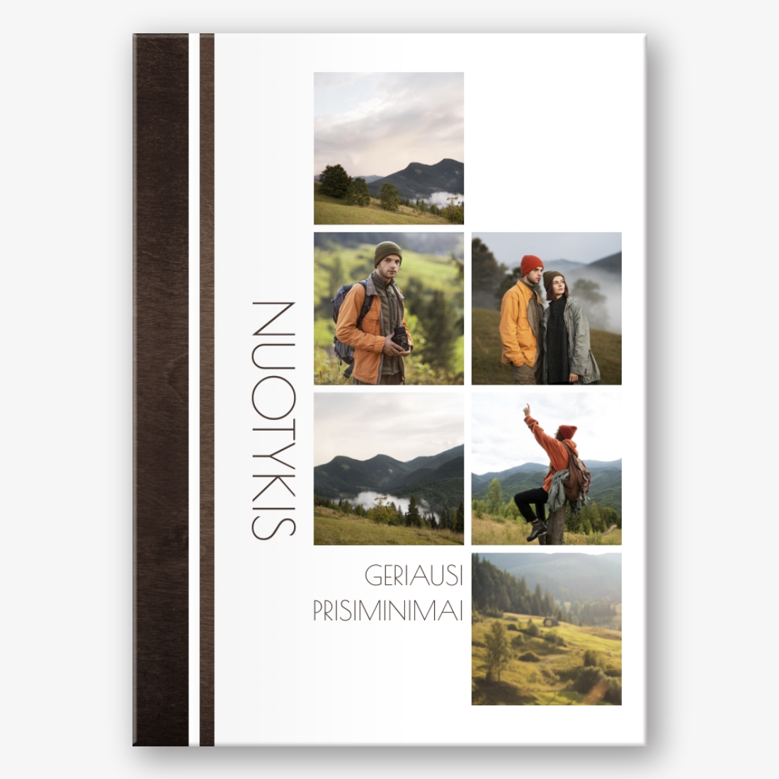 Paruoštas vertikalios fotoknygos šablonas kietame viršelyje "Nuotykių Laikas" yra idealus pasirinkimas tiems, kurie vertina ryškias akimirkas ir nori jas išsaugoti unikalioje formoje. Šis šablonas ypač tinka profesionalams, dirbantiems turizmo, kelionių ar aktyvaus poilsio srityse. Kelionių organizatoriai gali jį naudoti kurdami spalvingus kelionių fotochronikos albumus, o fotografai – pristatyti savo darbus, susijusius su gamta ir nuotykiais. Tačiau "Nuotykių Laikas" yra ne tik gatavas sprendimas, bet ir kūrybiškumo pagrindas. Mūsų internetinis dizaineris siūlo platų redagavimo galimybių spektrą. Galite keisti foną, pridėti savo nuotraukas, tekstą, ir dekoratyviniai elementai. Jei jums reikia pakeisti nuotraukų vietą arba pridėti naujų puslapių, dizaineris leidžia tai padaryti tiesiog keliais paspaudimais.